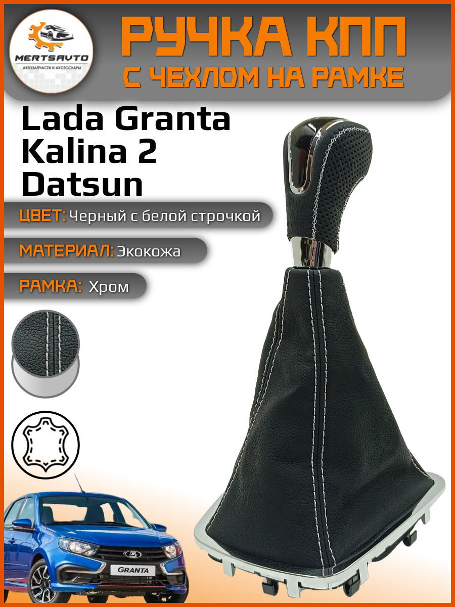Купить Ручка КПП с чехлом в стиле Весты на Лада Гранта, Лада Калина-2, Дацун, рамка хром, черный с белой строчкой