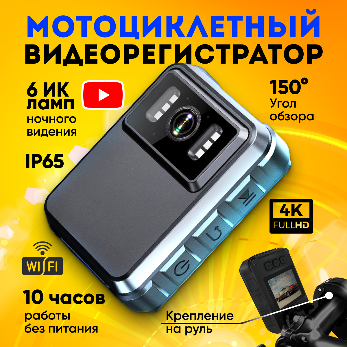 Видеорегистратор для автомобиля, для мотоцикла, для велосипеда, WI-FI, 4K, FullHD, IP65