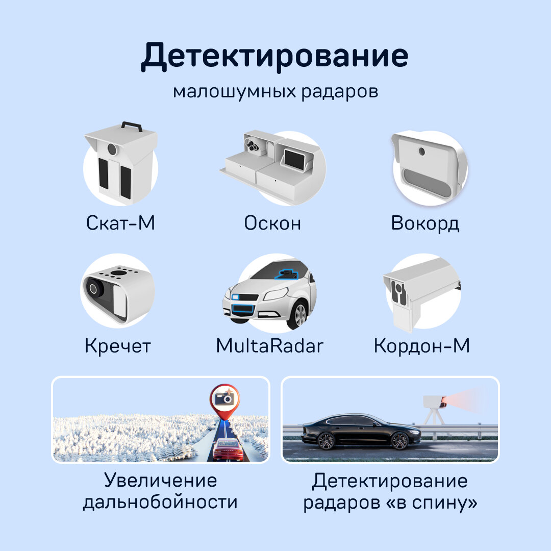 | Обнаружение радаров | "K-диапазон", "Ka-диапазон", "Ku-диапазон", "Lazer", "Mesta", "Multiradar", "X-диапазон", "АМАТА", "Автоураган", "Арена", "Беркут", "Бинар", "ВКС", "Визир", "Вокорд", "Искра", "Кречет", "Крис", "ЛИСД 2", "ЛИСД", "Одиссей", "Полискан", "Радис", "Рапира", "Сергек", "Скат", «Robot», «Автодория», «Кордон», «Стрелка» |