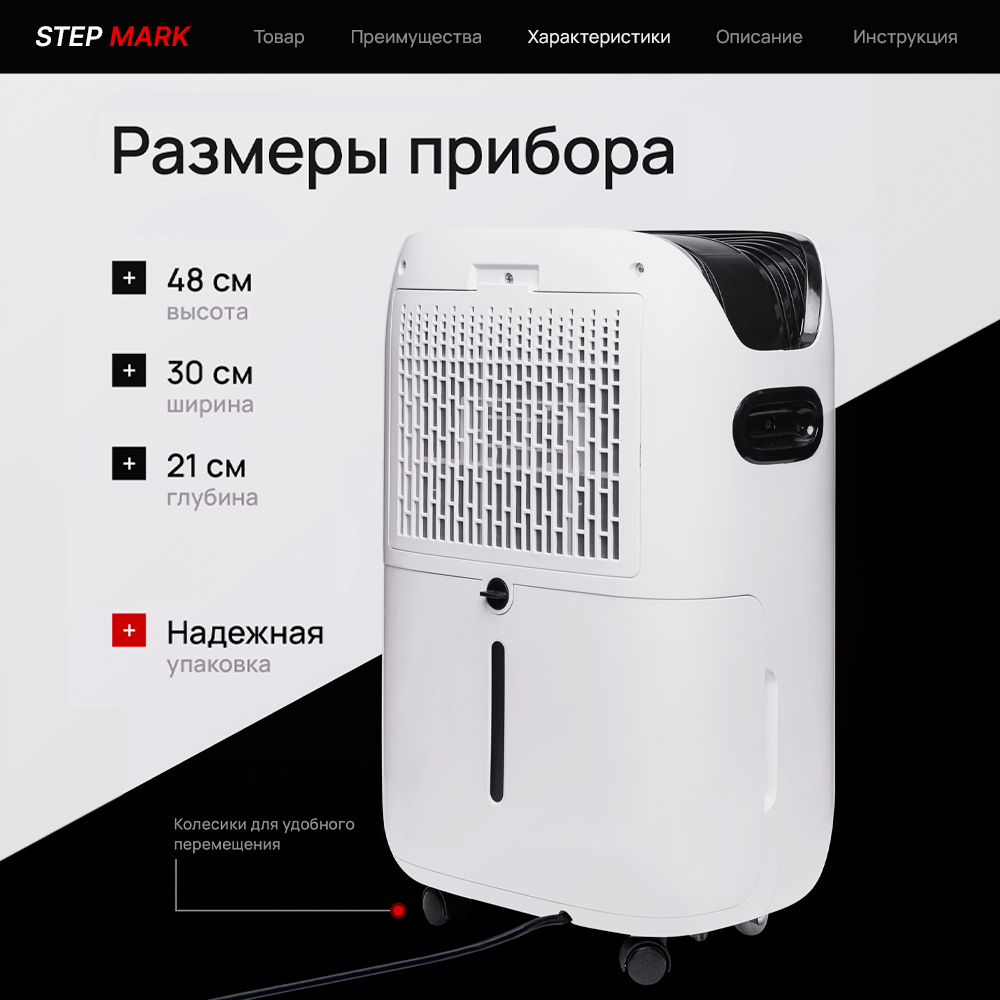 | Особенности | встроенный гигрометр / датчик утечки воды / дисплей / колёса / ручка для переноски |