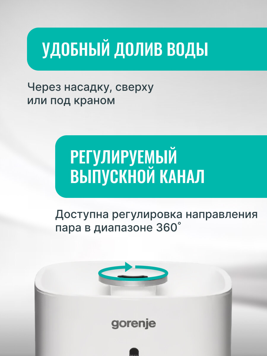Ультразвуковой увлажнитель воздуха для дома Gorenje H45W, 4.5 л, компактный и тихий с регулировкой уровня влажности, холодный пар, 3 способа добавления воды и регулировка выпускного канала интересное: