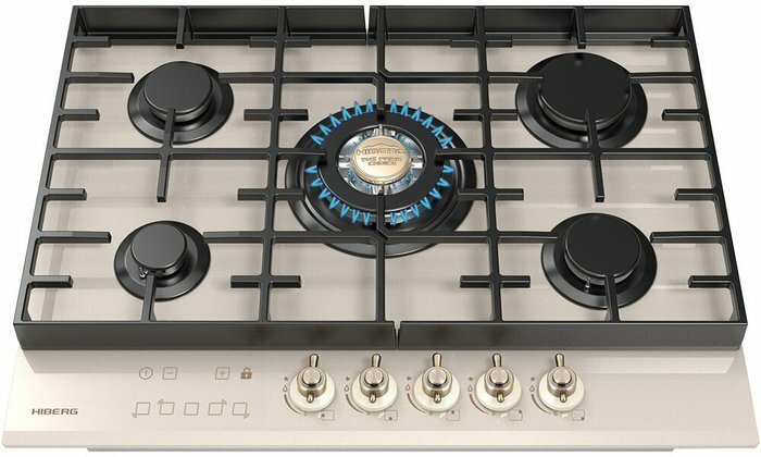 Газовая варочная поверхность HIBERG VM 7155 Y, 5 конфорок, таймер отключения газа всех конфорок, газ-контроль, электроподжиг, чугунные решетки.