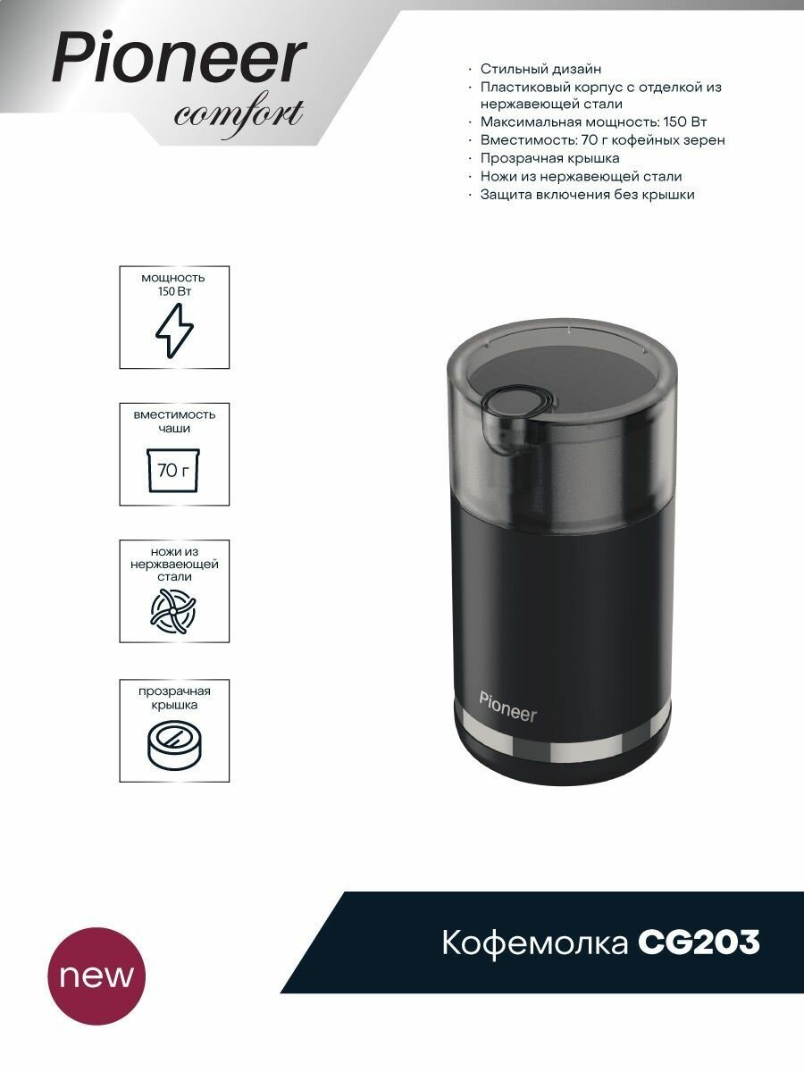 Кофемолка электрическая Pioneer CG203, импульсный режим, чаша 70 г, ножи из нержавеющей стали, 150 Вт интересное: