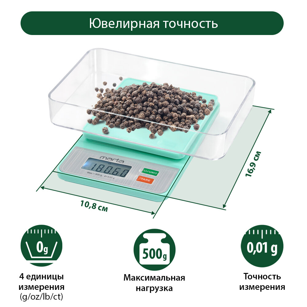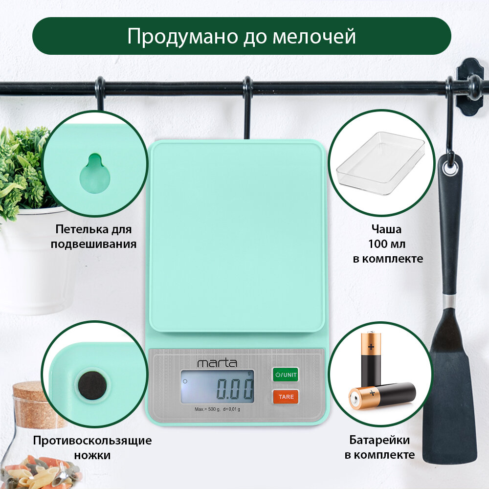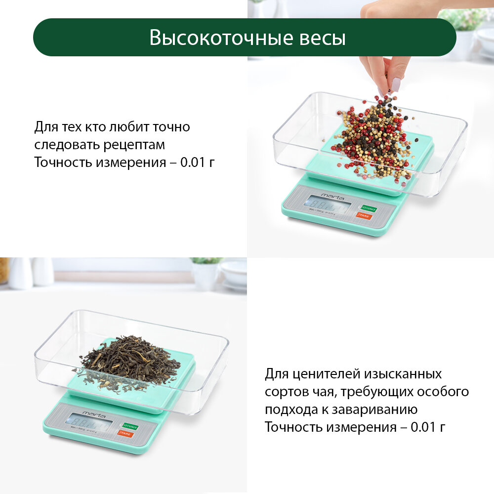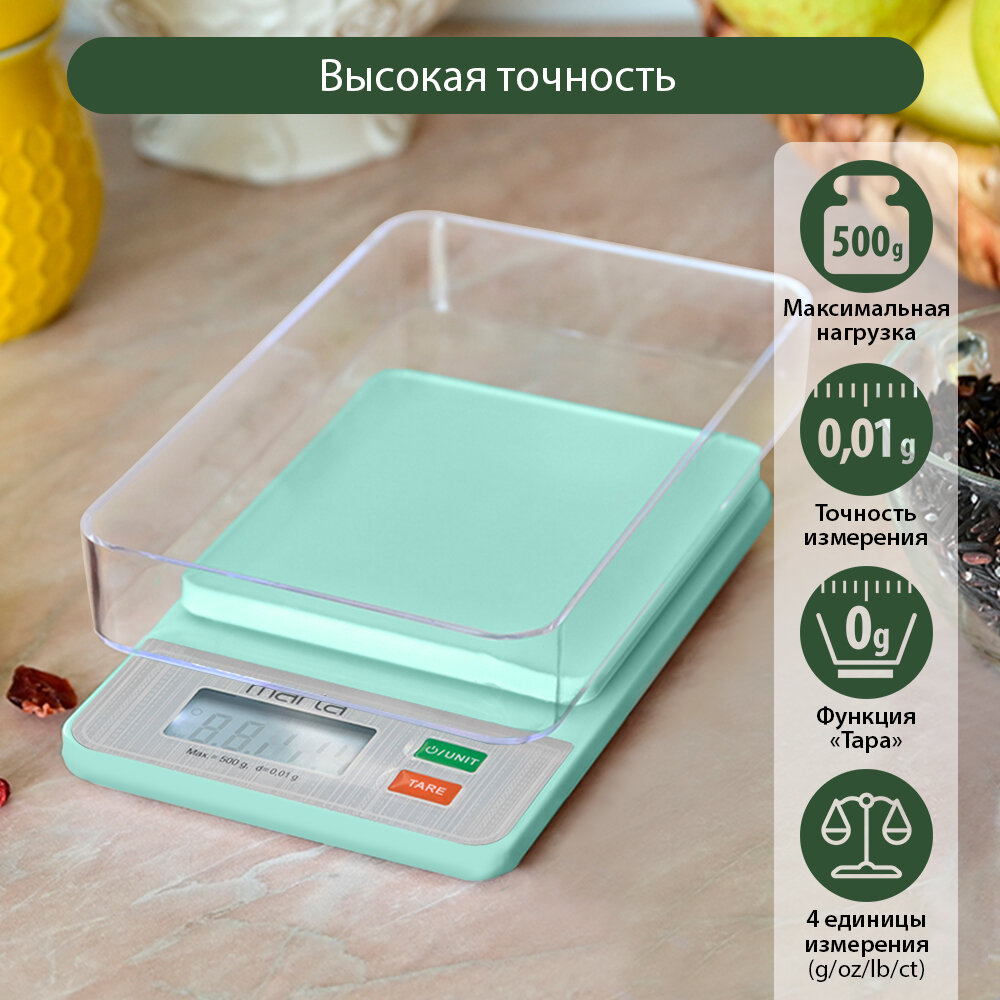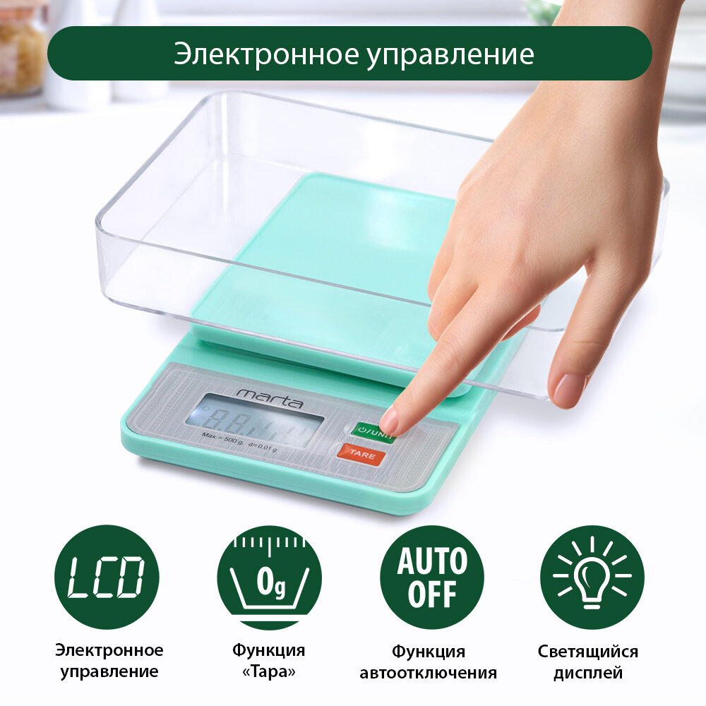 Кухонные весы MARTA MT-SC1652, точность 0,01 г, предел взвешивания 0,5 кг интересное: