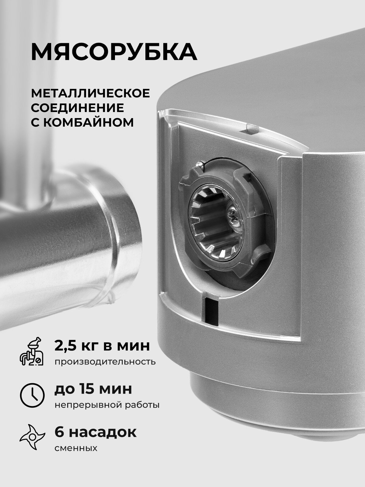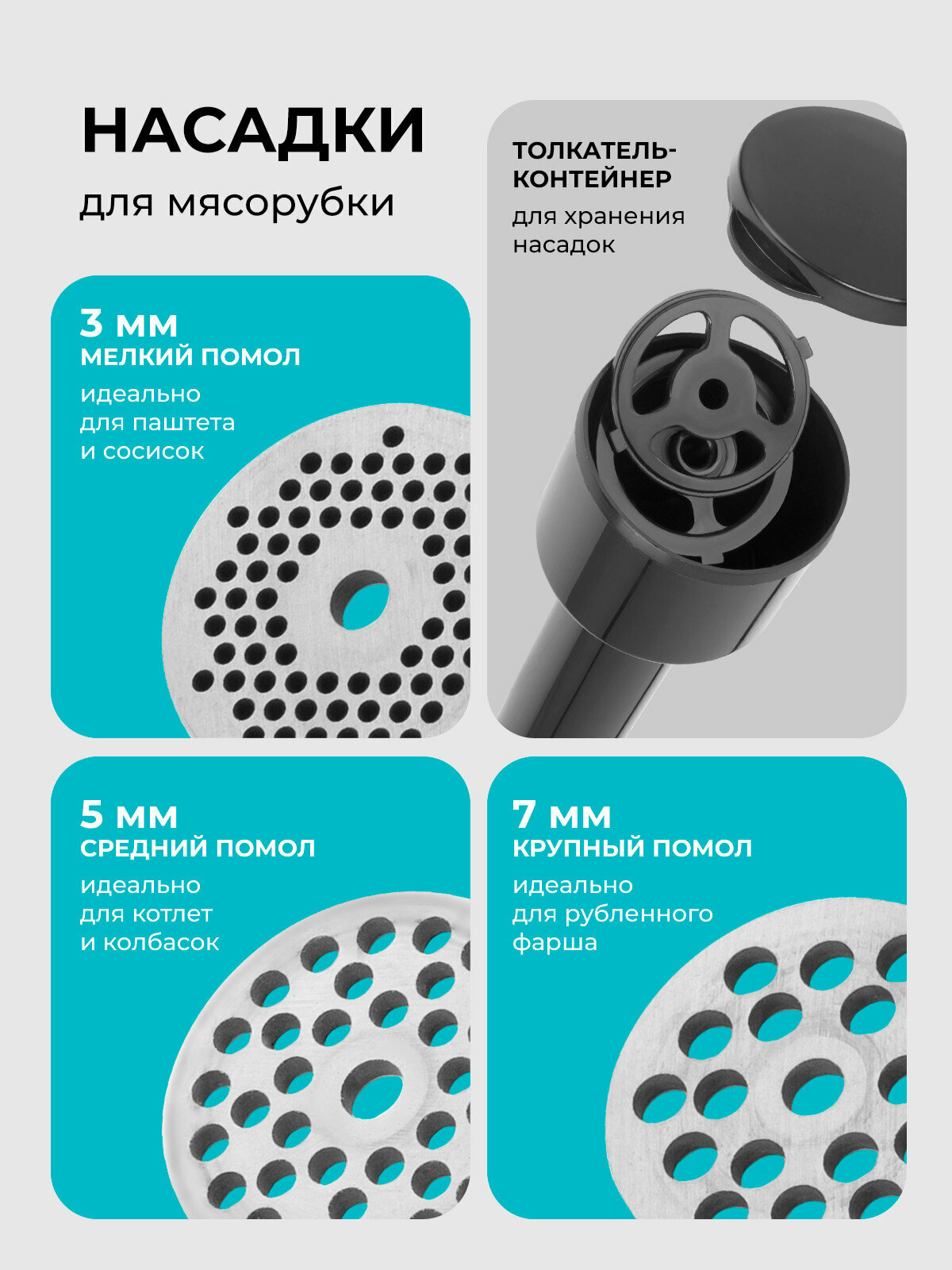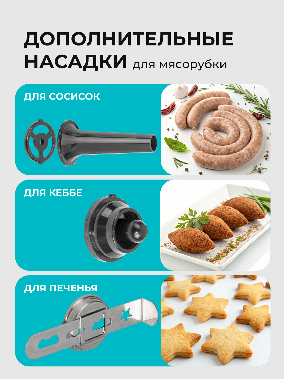 | Дополнительные насадки | для кеббе / для колбасок / для нарезки соломкой |