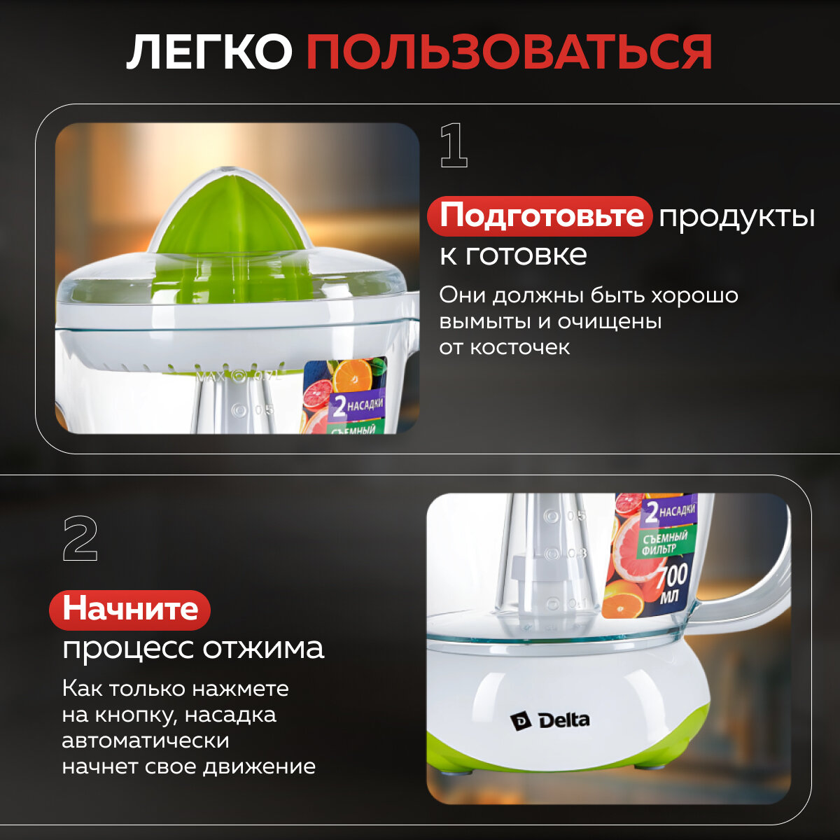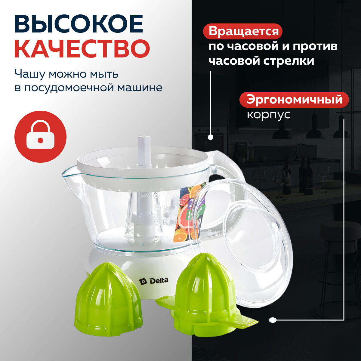 Соковыжималка центробежная DELTA DL-0234, 25 Вт, 700 мл, 2 насадки, белый с зеленым интересное:
