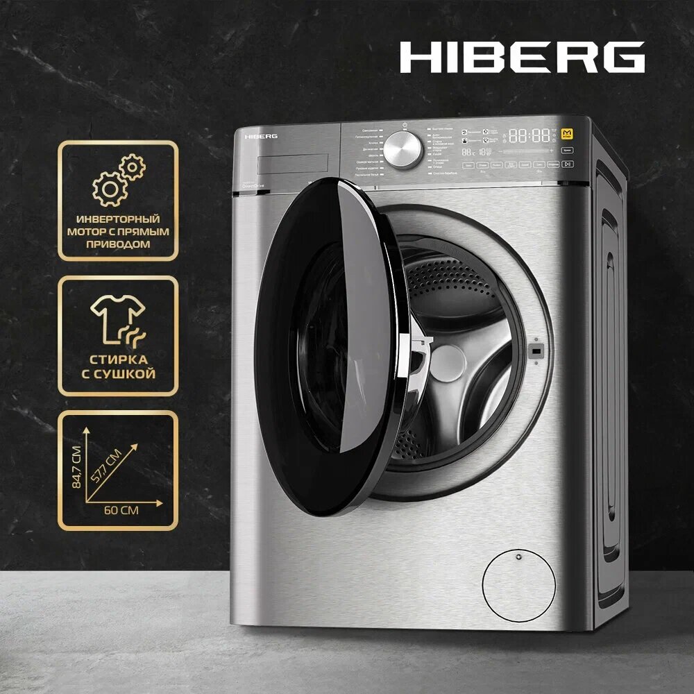 Стиральная машина с сушкой HIBERG i-DDQ8 - 10614 Ss, Inverter, Прямой привод DD, М-Smart - стирка в одно касание, Озонирование, Подсветка барабана, 10,5 кг, 1400 оборотов, 6 кг сушка