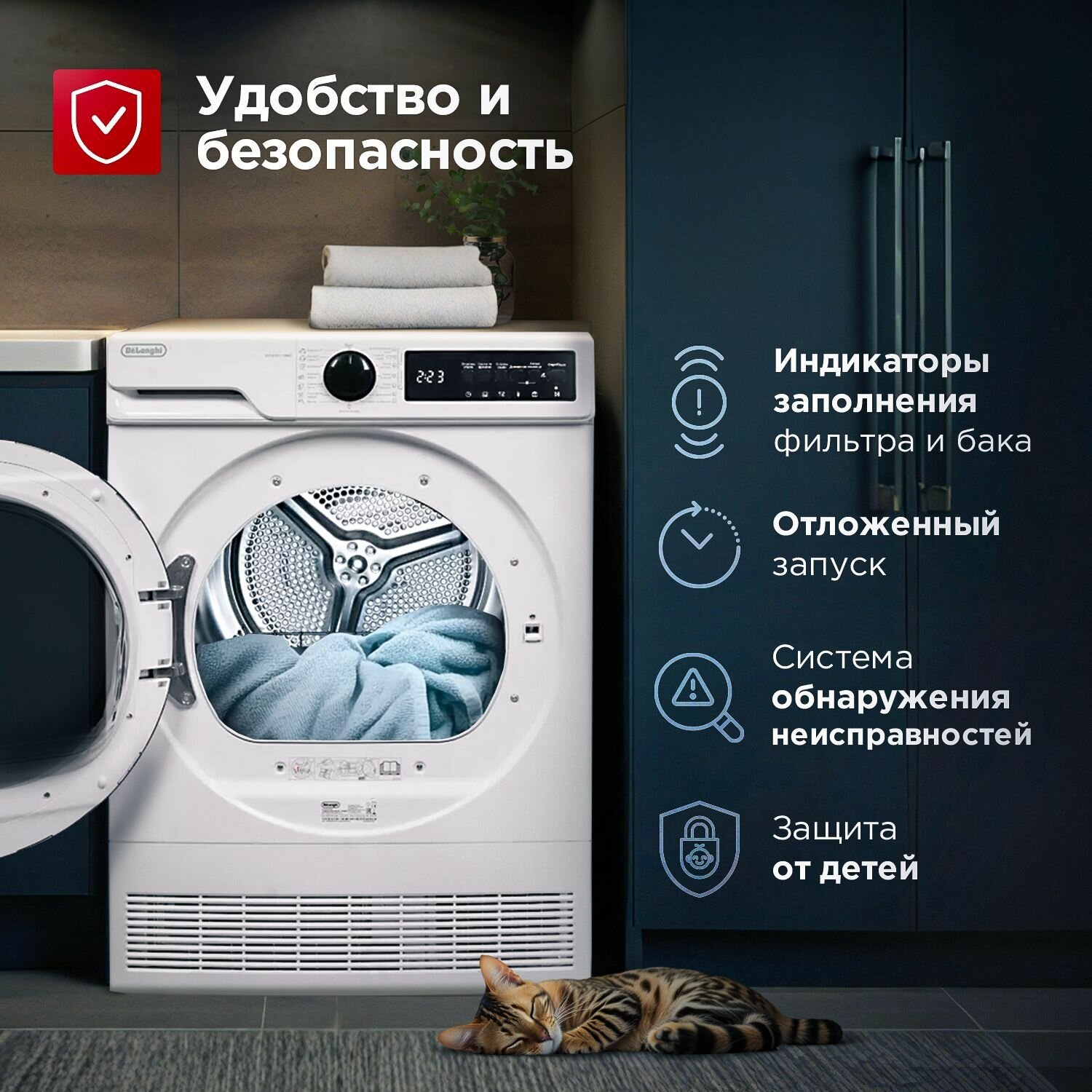 Сушильная машина DeLonghi DTD 8105 C FABIO, 8 кг, 15 автоматических программ, 4 уровня сушки, защита от перегрева, отсрочка запуска, белая интересное: