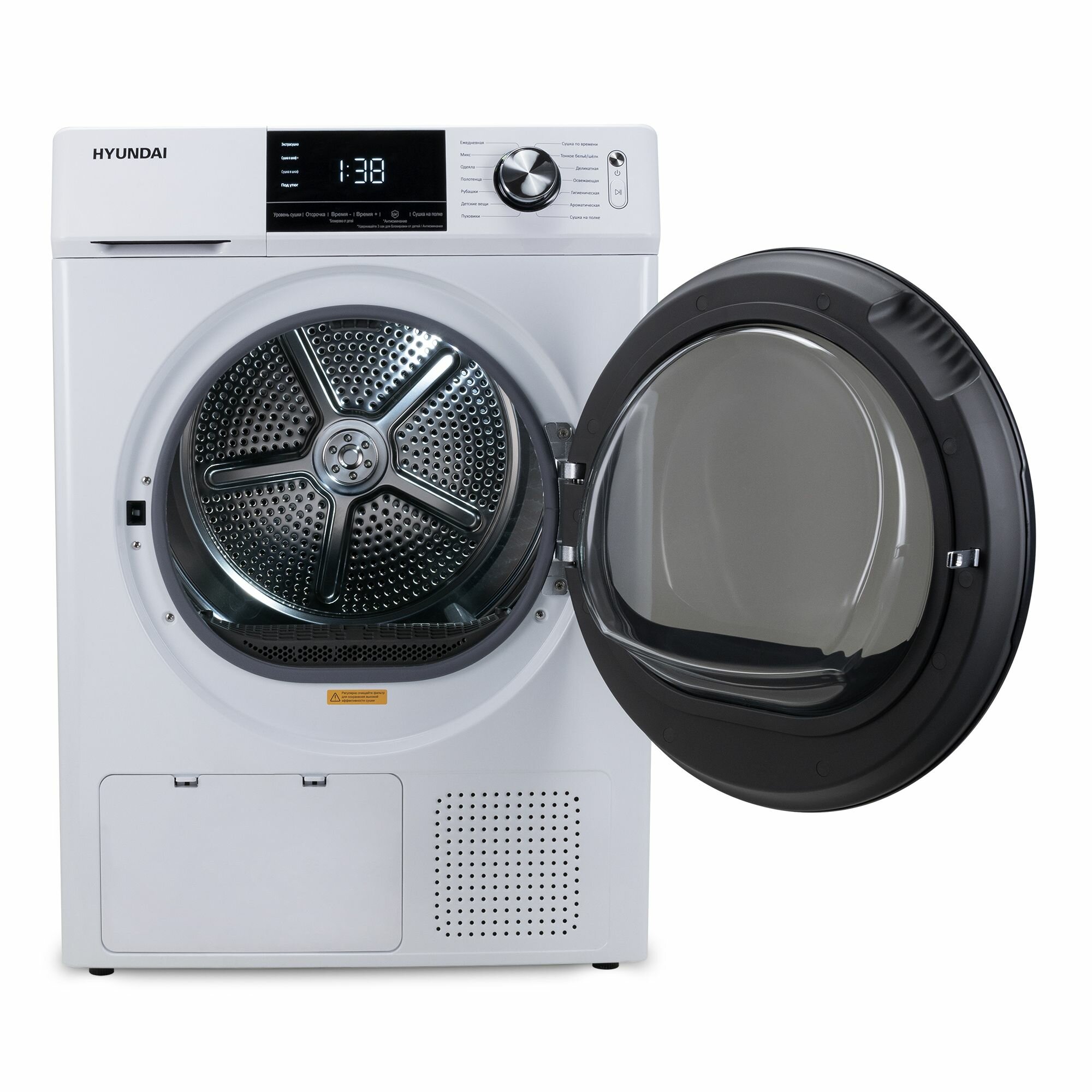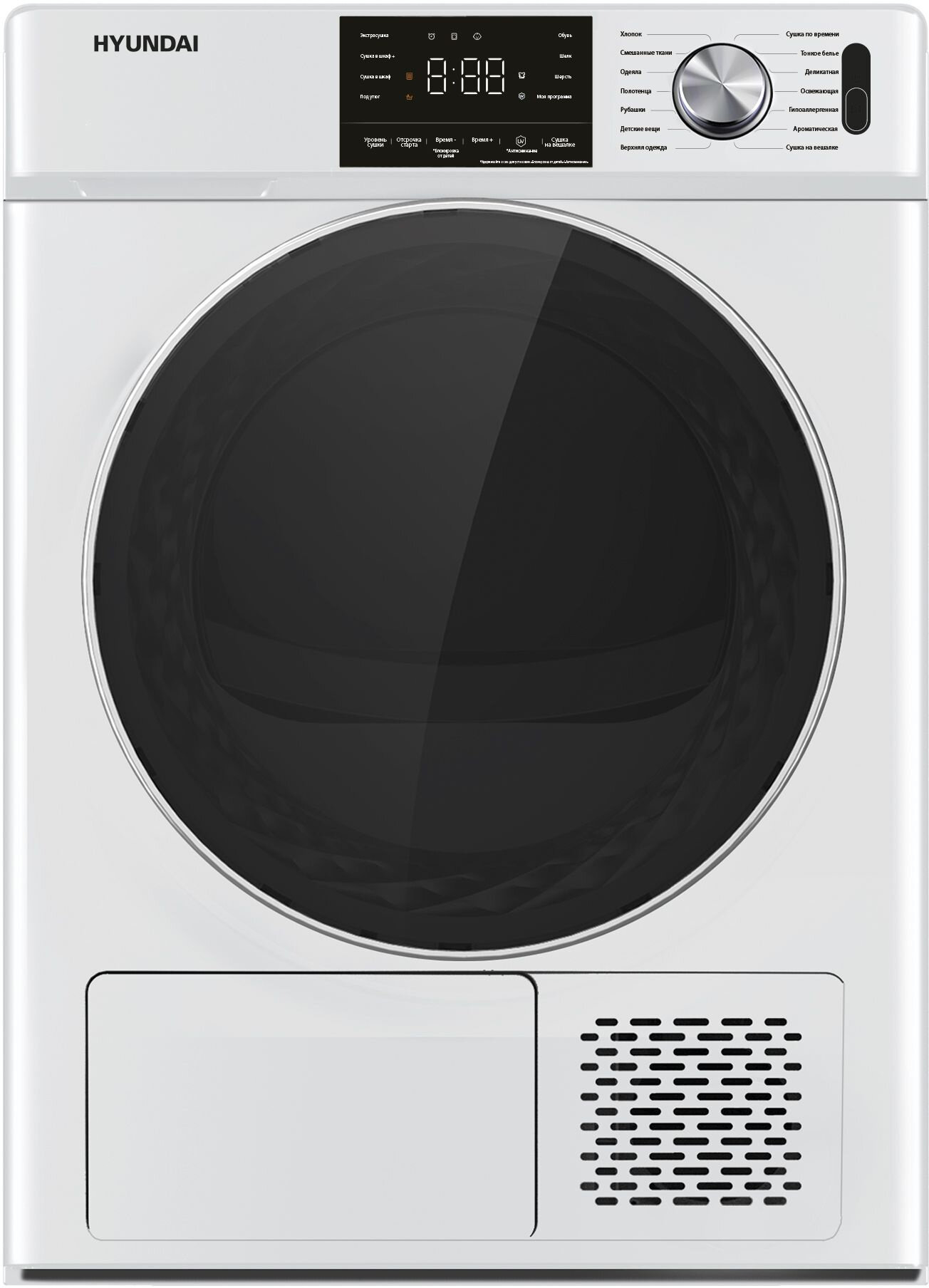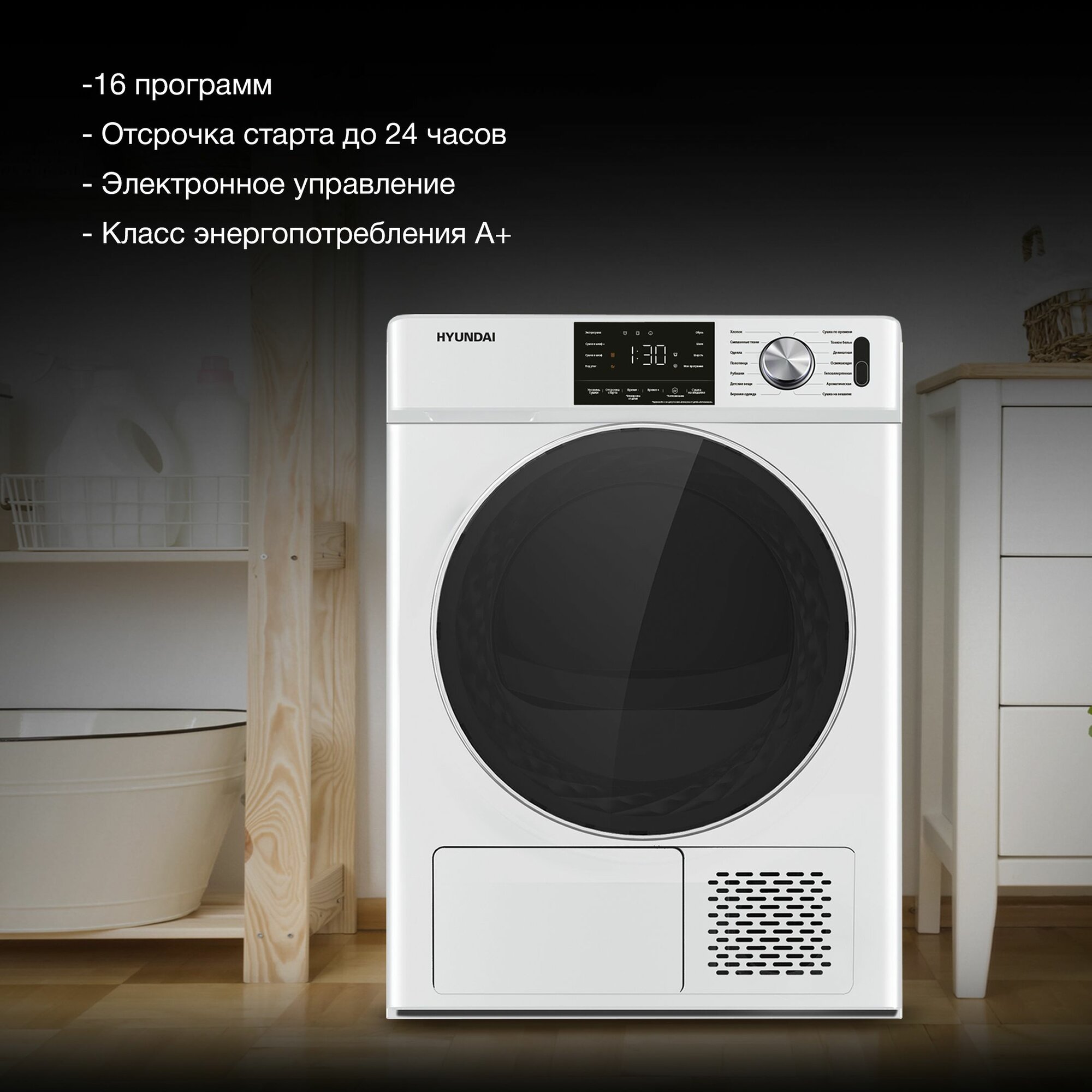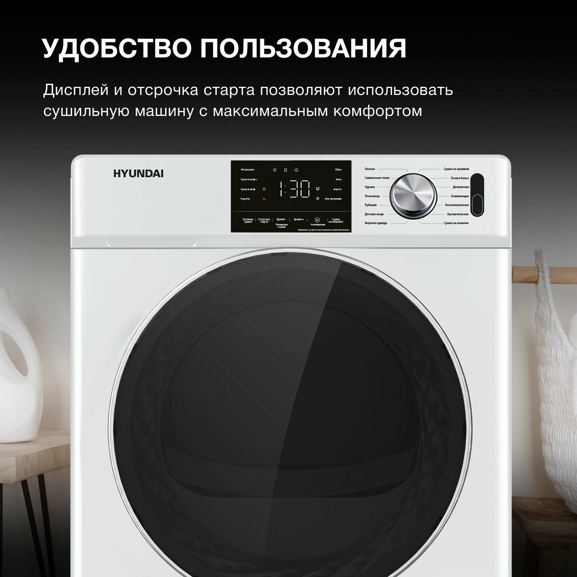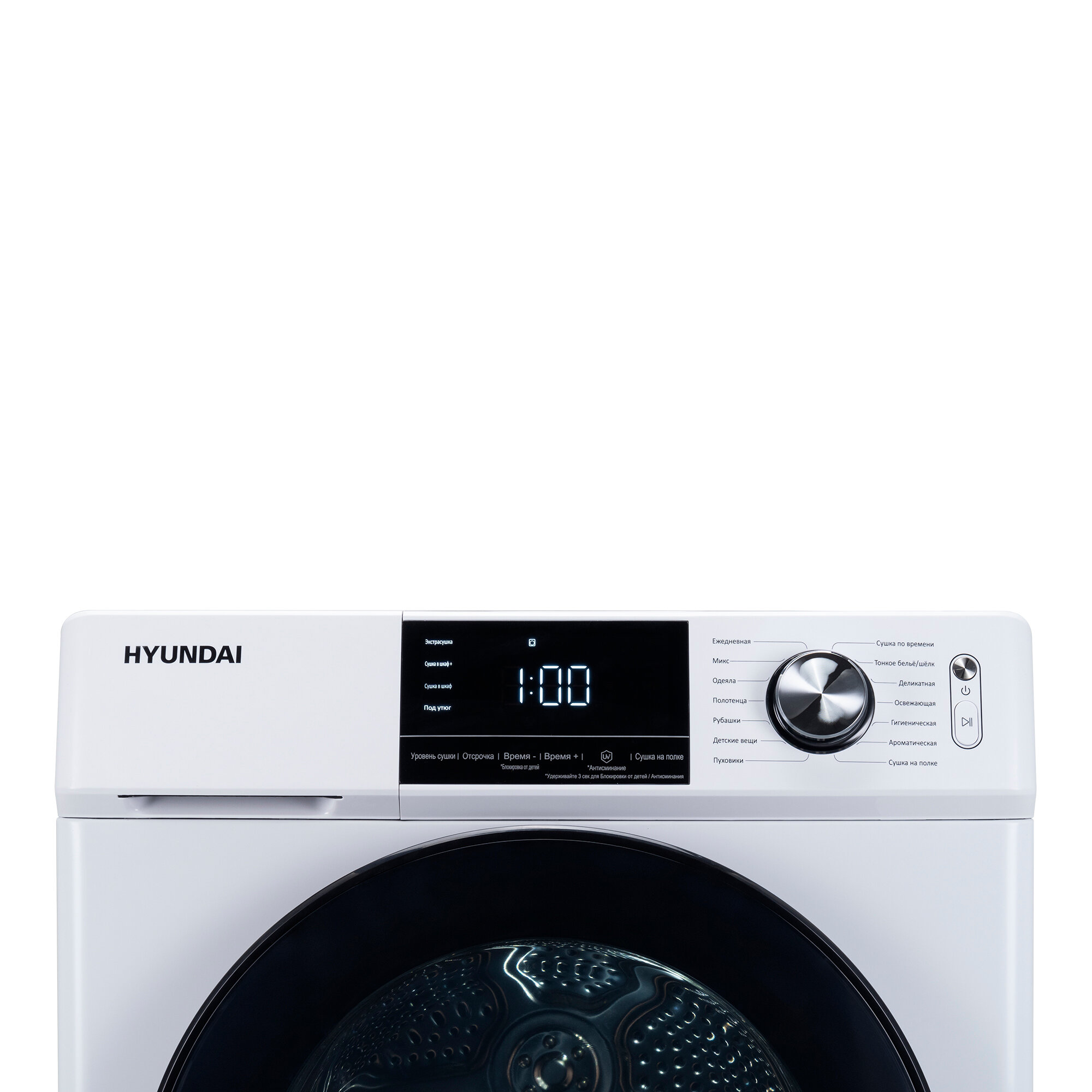 Купить Сушильная машина HYUNDAI DFE 9401 с тепловым насосом, глубина 62 см, загрузка 10 кг, отсрочка старта, индикация влажности белья, белый