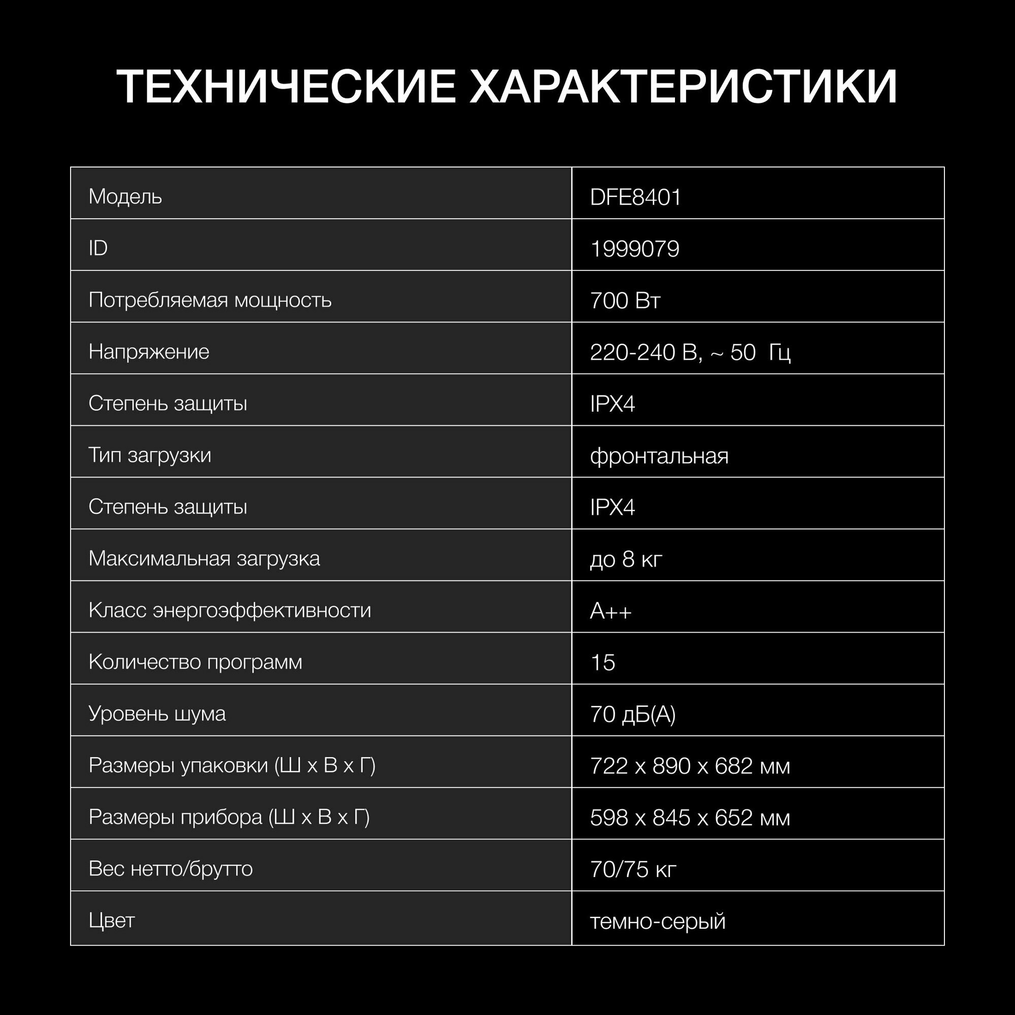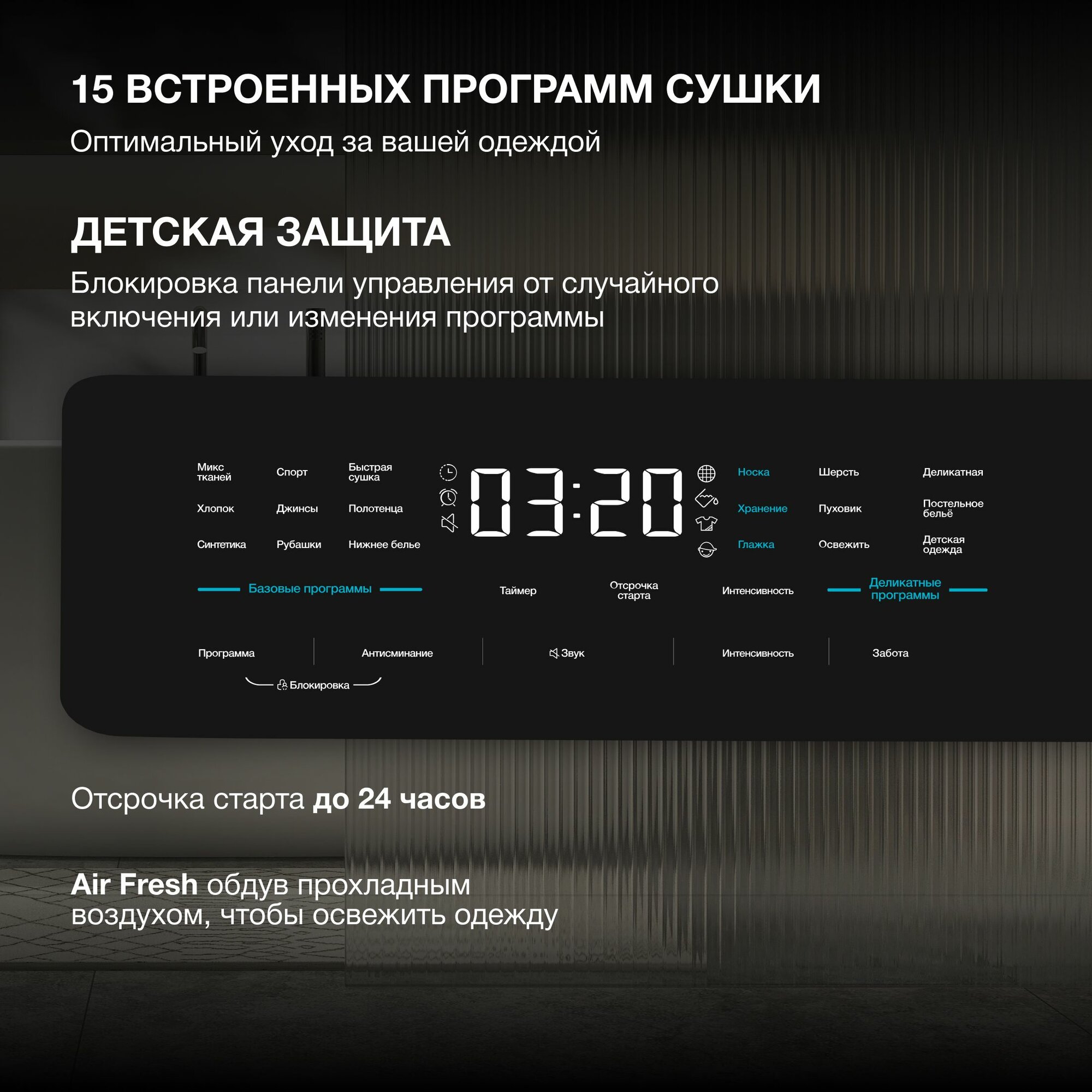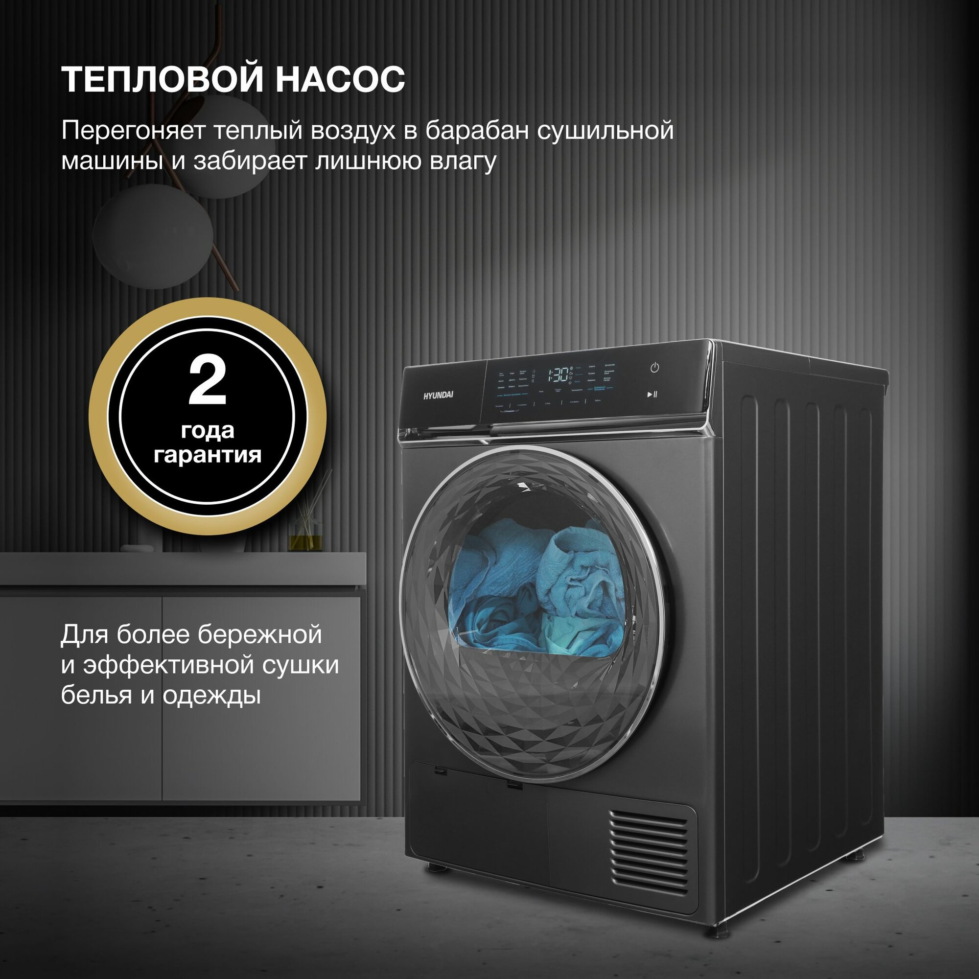 СохранитьСушильная машина Hyundai DFE8401 с тепловым насосом, глубина 65 см, загрузка 8 кг, 15 программ, отсрочка старта, индикация влажности белья, серый интересное: