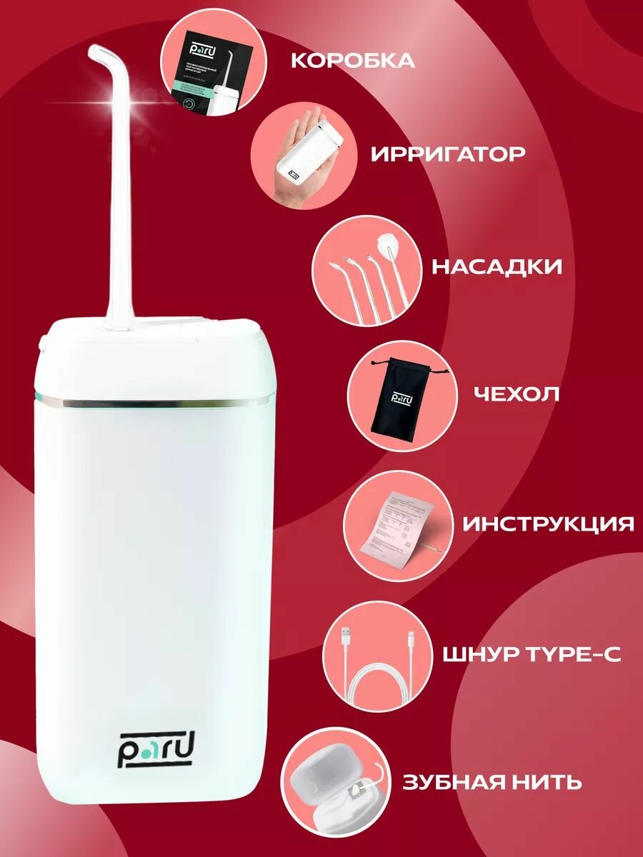 | Подробная комплектация | Подарочная коробка, ирригатор, насадки, инструкция, шнур Type-C, непромокаемая косметичка |