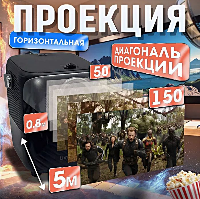Проектор UMIIO Full HD 1080p Android TV, Портативный Smart с Wi-Fi 5G, HDMI, Для дома, дачи, офиса, Черный