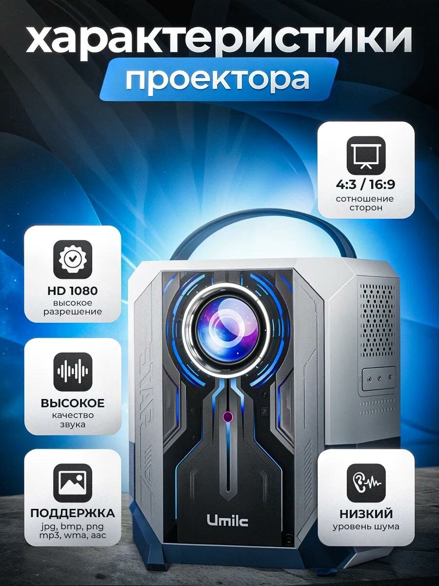 Проектор Umiio Q2(А010) Ultra c разъемом hdmi для работы, фильмов, YouTube, приставок PlayStation или X-Box и других гаджетов / Чёрный