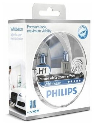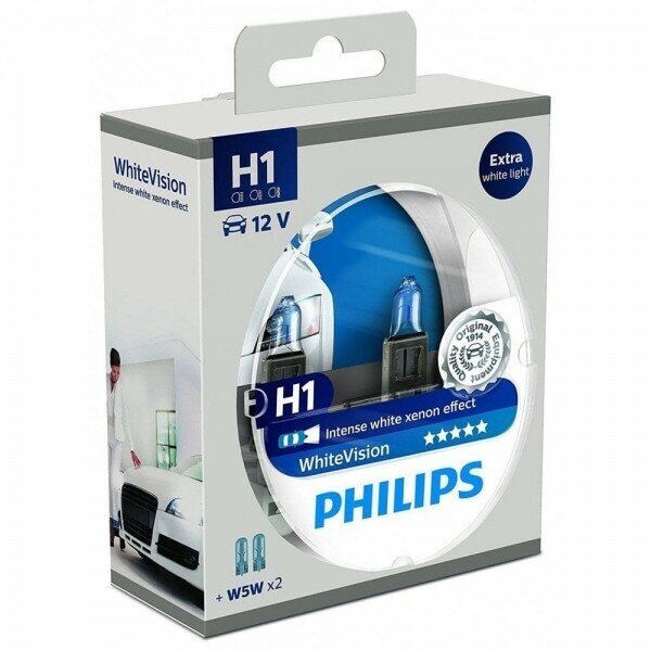 Купить Лампы H1 12V 55W 4300K Whitevision + W5w 12V (2+2Шт) Philips арт. 12258WHVSM