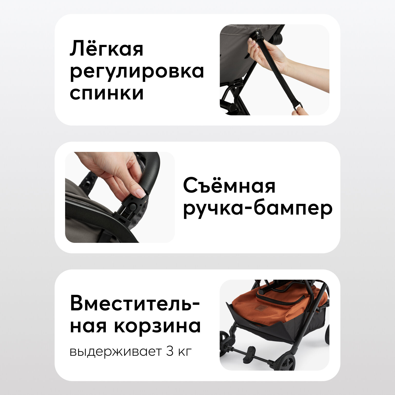 | Комплектация | коляска / дождевик / москитная сетка / подстаканник / Съемный бампер |