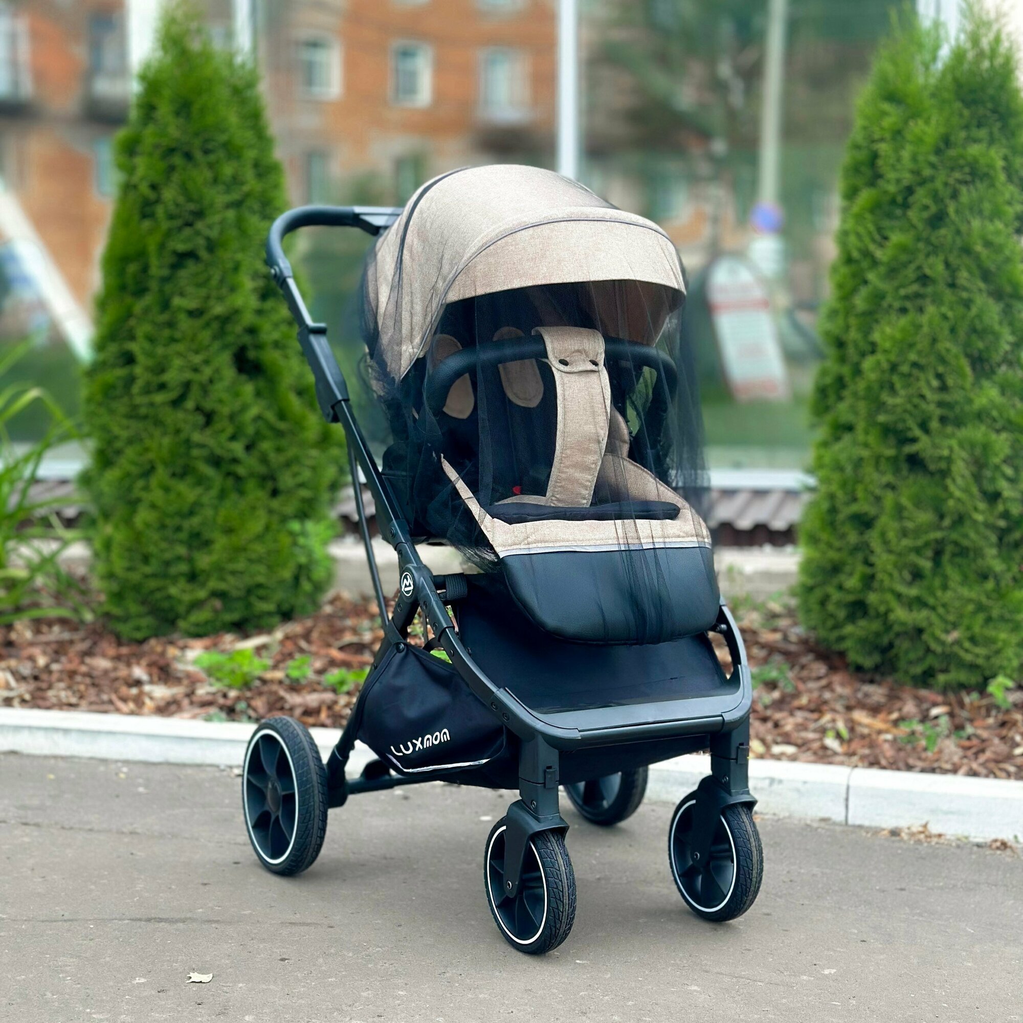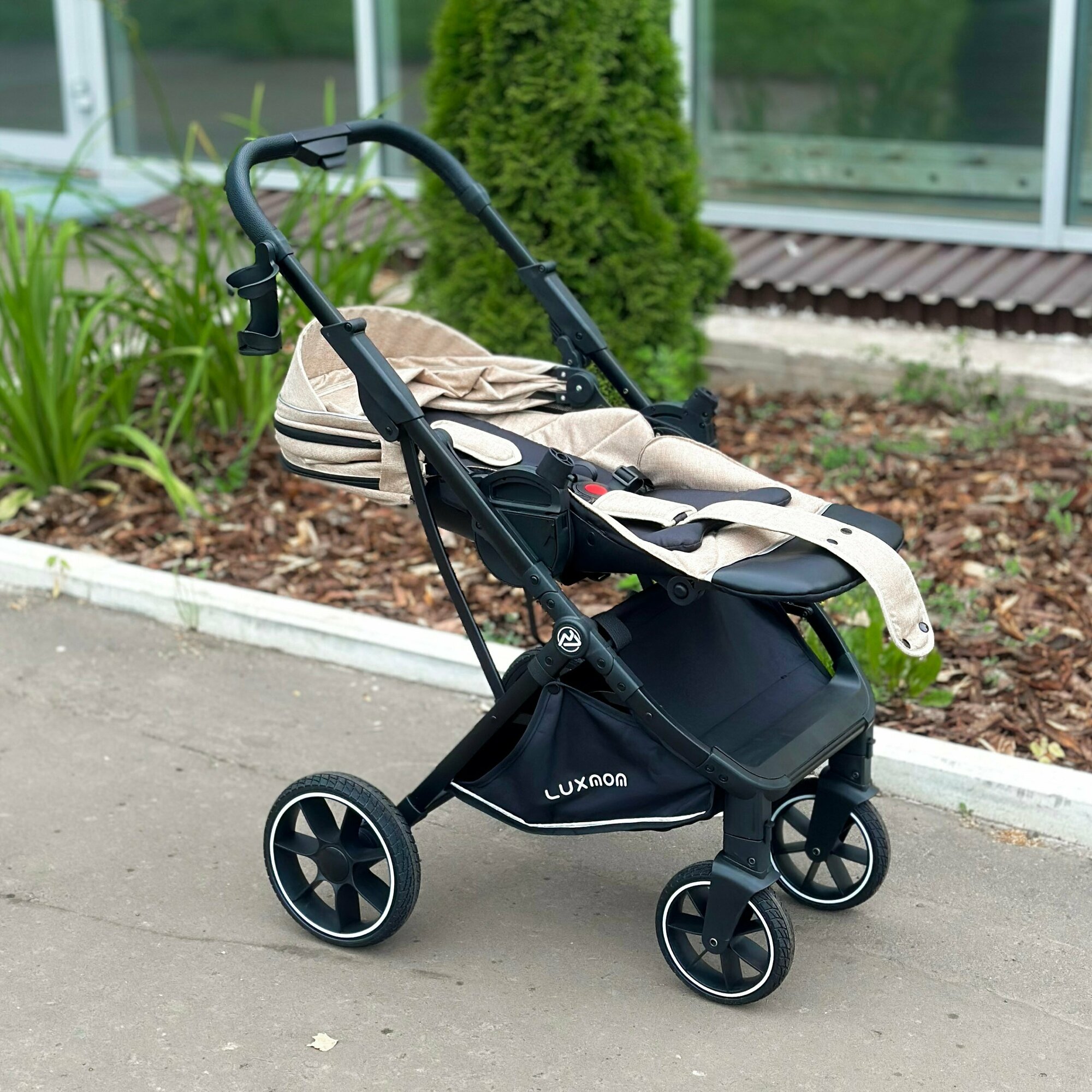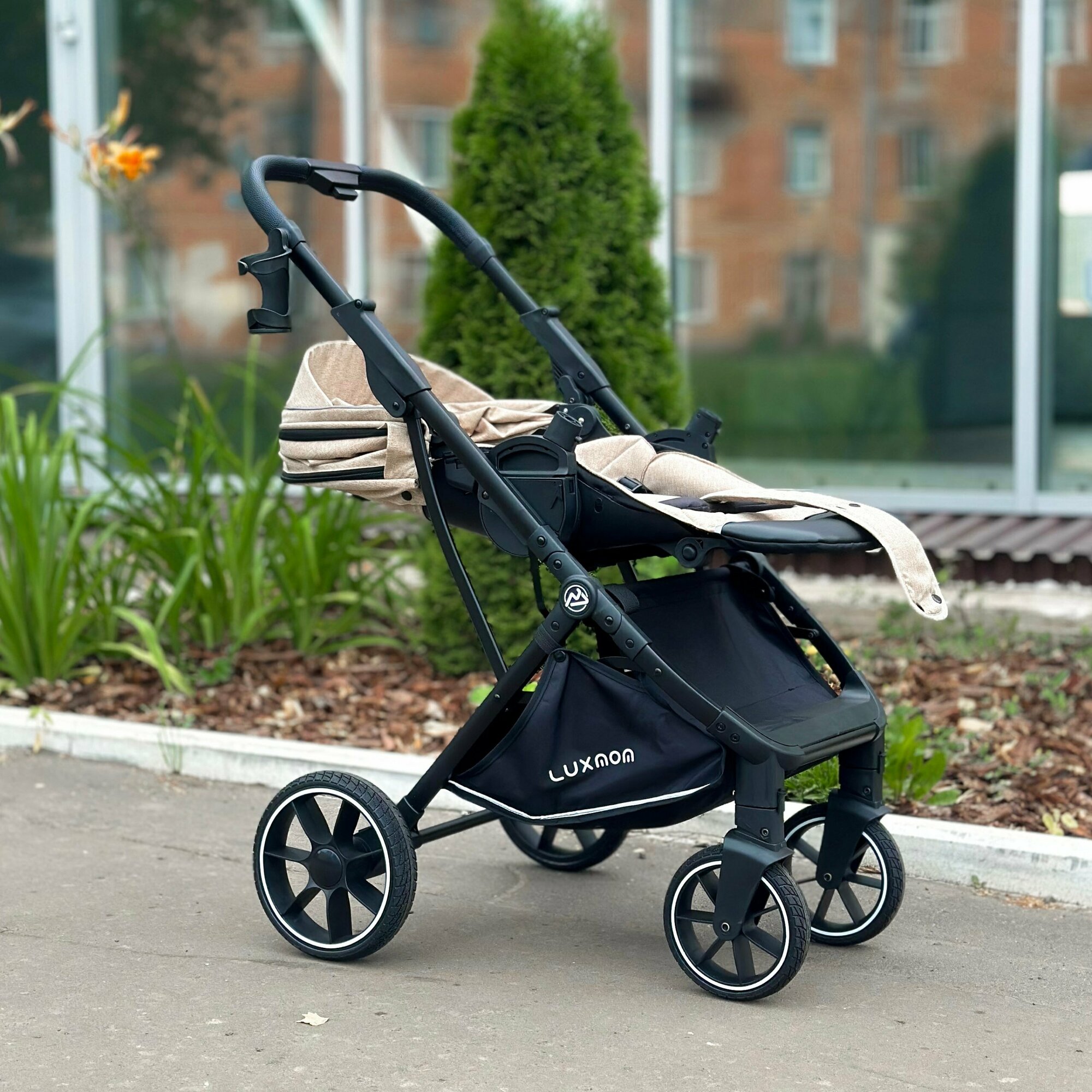 Прогулочная коляска LUXMOM 740 с реверсивным блоком, бежевый/чёрная рама + рюкзак