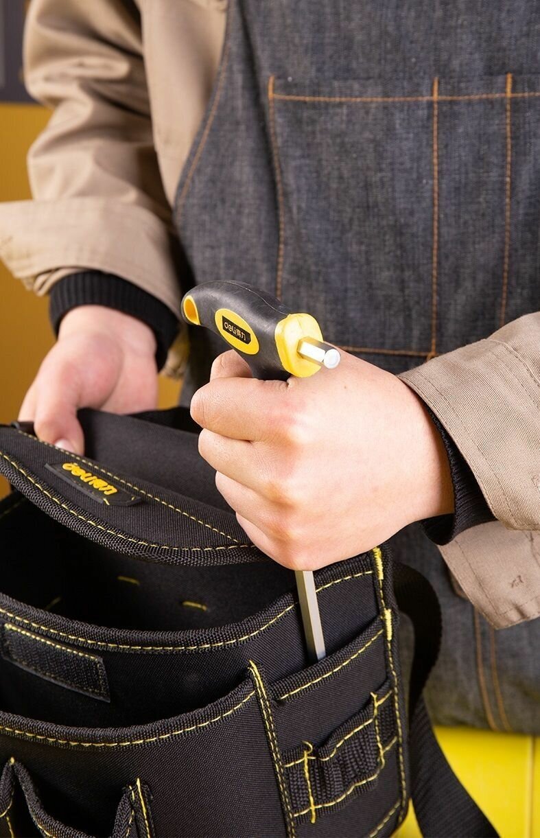 Поясная сумка монтажника электрика для инструмента с ремнем плотная Deli DL-P4 220x200x140мм для хранения и переноски (6 карманов, ткань Оксфорд 600D)