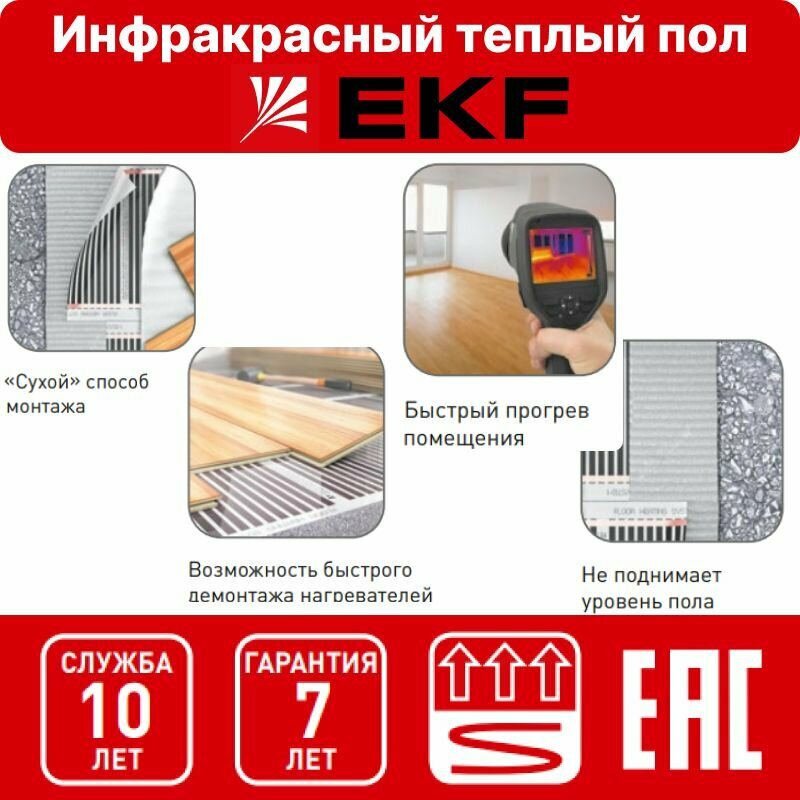 СохранитьИнфракрасный теплый пол 1540Вт 7 кв. м, EKF, ширина 0,5 метра, пленочный, под твердые и мягкие напольные покрытия, "сухой" монтаж интересное: