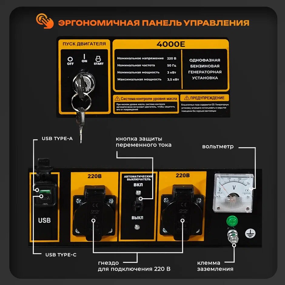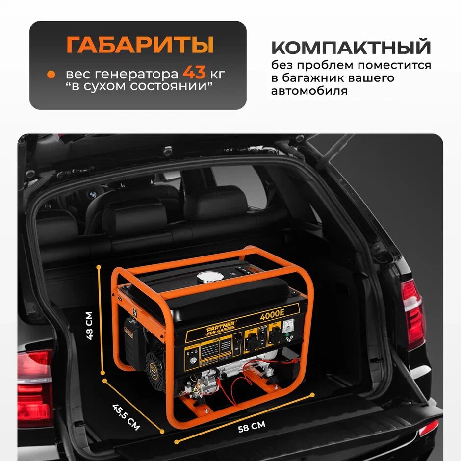 Генератор бензиновый / Бензогенератор Partner for garden 4000Е ( 4.875 кВа максимальная нагрузка , 220 В / 12 В, 3 / 3.5 кВт, 50 Гц, 7 л. с, электростартер + АКБ ) интересное: