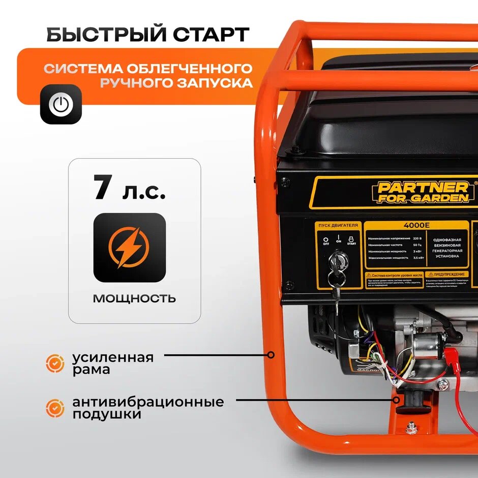 Купить Генератор бензиновый / Бензогенератор Partner for garden 4000Е ( 4.875 кВа максимальная нагрузка , 220 В / 12 В, 3 / 3.5 кВт, 50 Гц, 7 л. с, электростартер + АКБ )