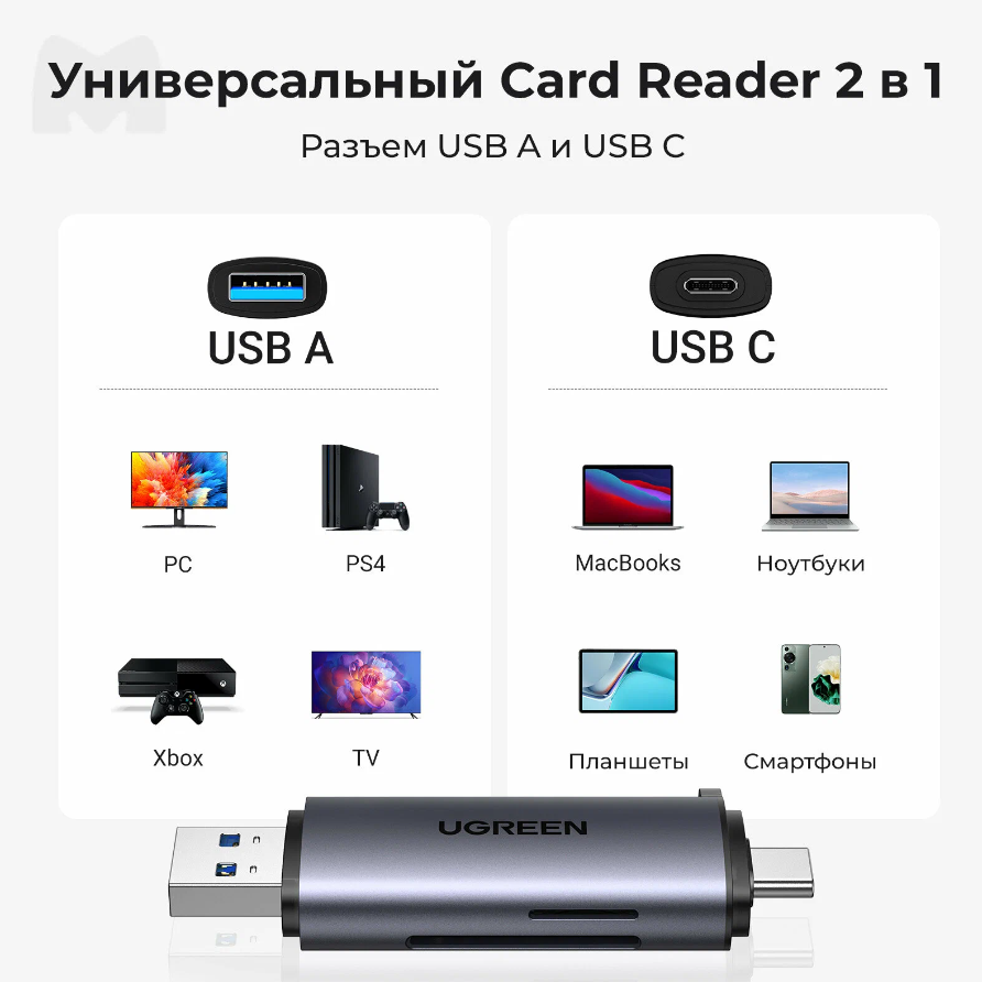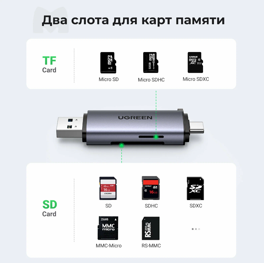 Картридер Ugreen USB-C + USB-A 3.0 для карт памяти TF/SD