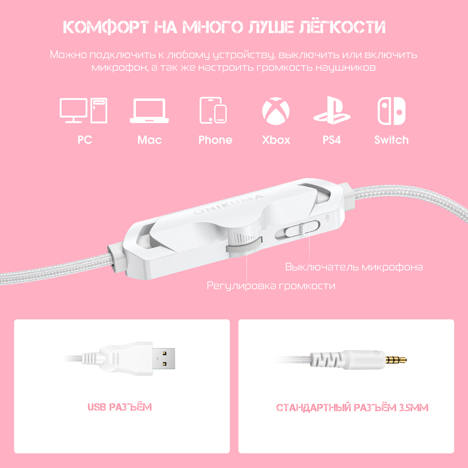 Игровые проводные наушники Onikuma X13, розовый, 3.5 мм, подсветка