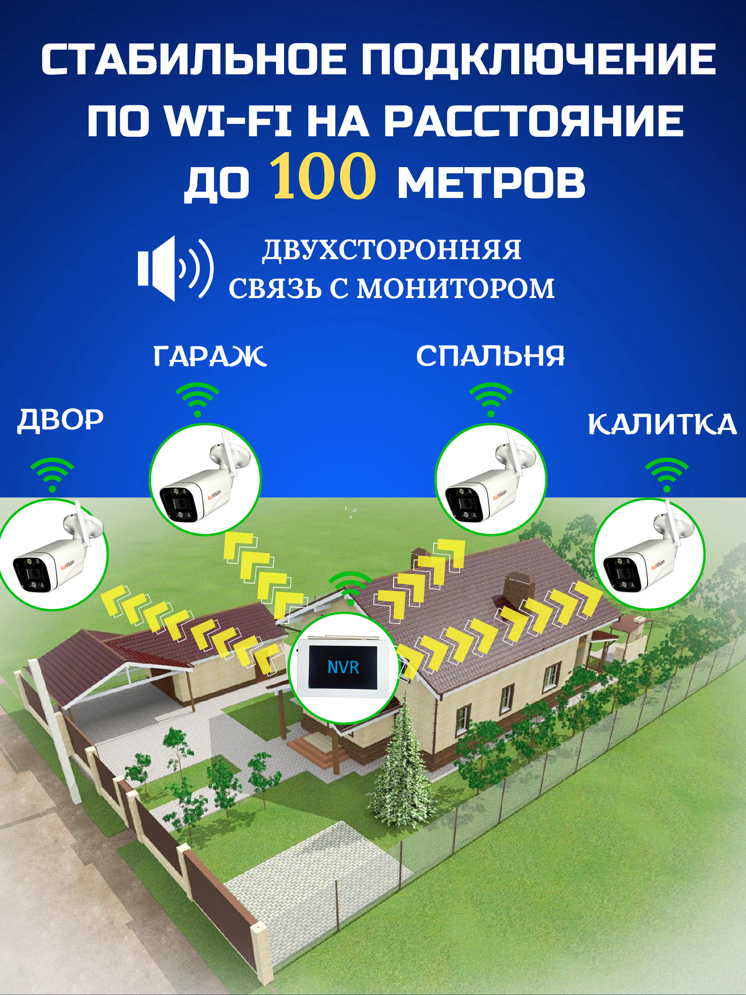 Готовый беспроводной комплект камер wifi видеонаблюдения на ip 4 камеры для дома улицы дачи квартиры уличный с монитором
