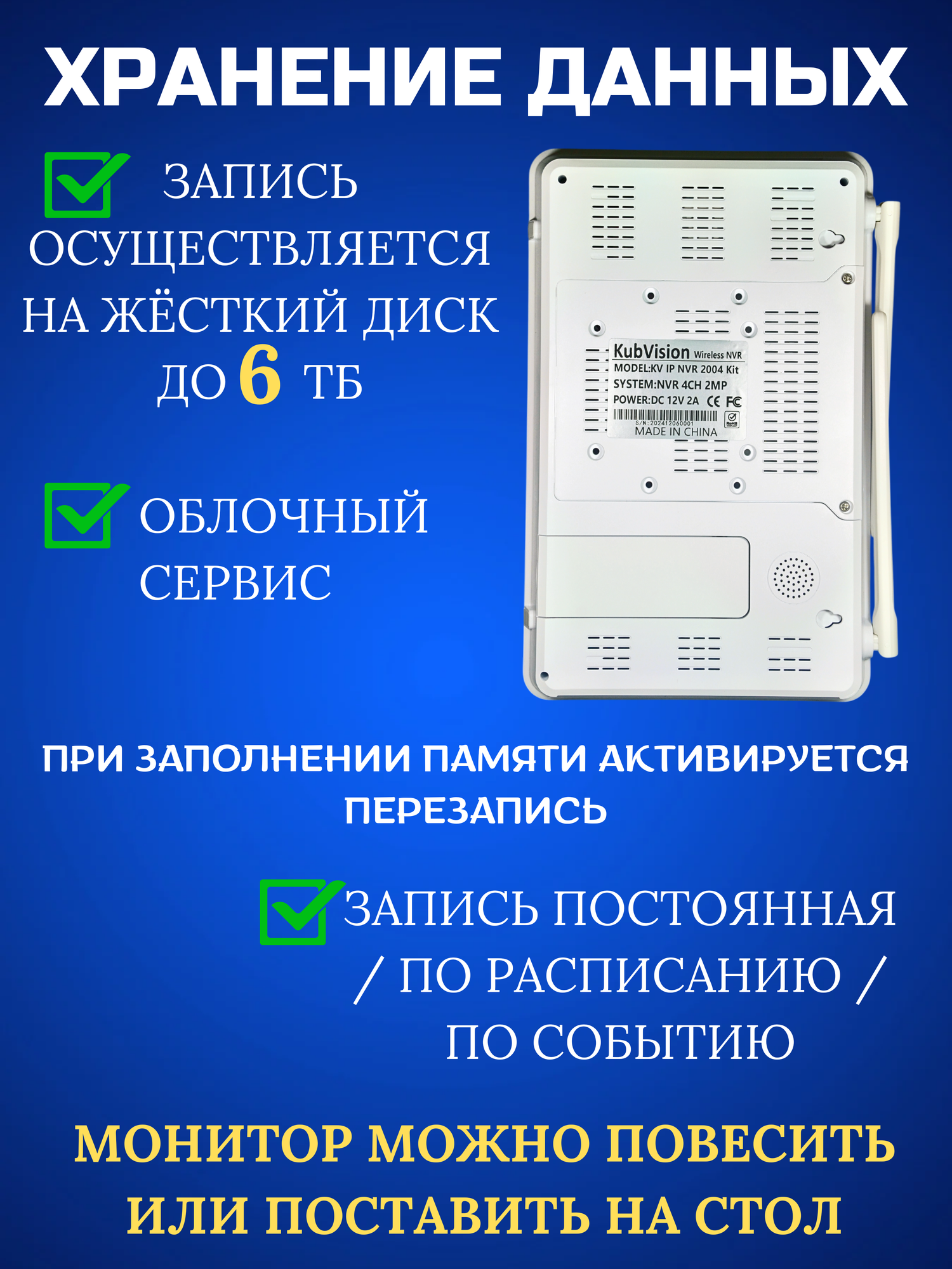 | Подробная комплектация | камера вайфай ip - 4 шт; монитор регистратор - 1 шт; блок питания - 5 шт; монтажный комплект - 5 шт; кабель rj45 - 1 шт; USB мышь - 1 шт; Инструкция - 1 шт; |