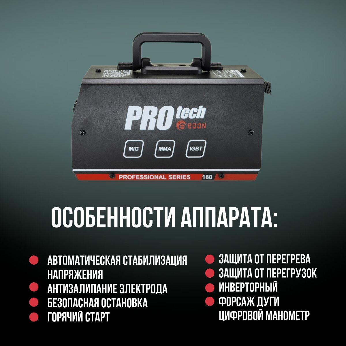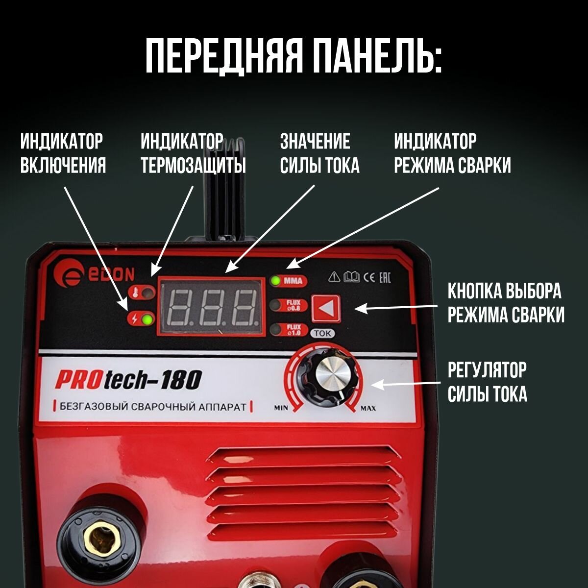 Сварочный полуавтомат Edon PROtech-180/ Инверторный аппарат/ Сварка в режимах MMA и MIG без газа/ Подарок отцу/ другу/ мужу