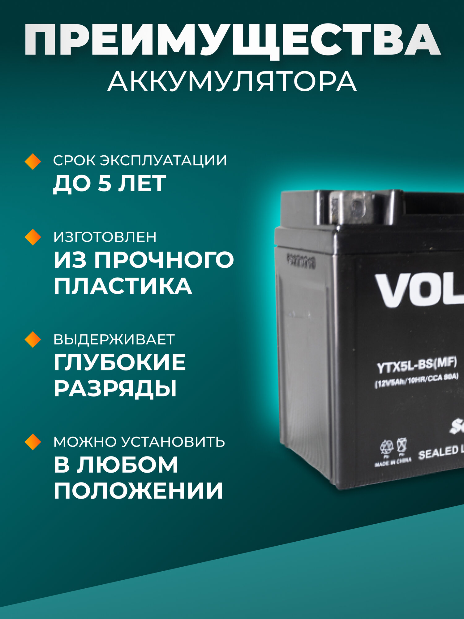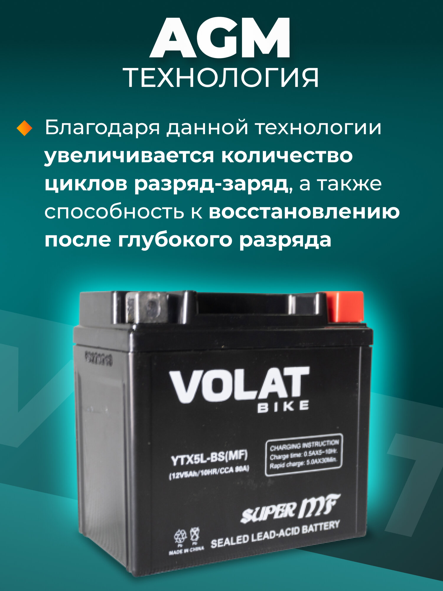 Аккумулятор для мотоцикла 12v Volat YTX5L-BS(MF) обратная полярность 5 Ah 80 A AGM, акб на скутер, мопед, квадроцикл, мотоцикл интересное: