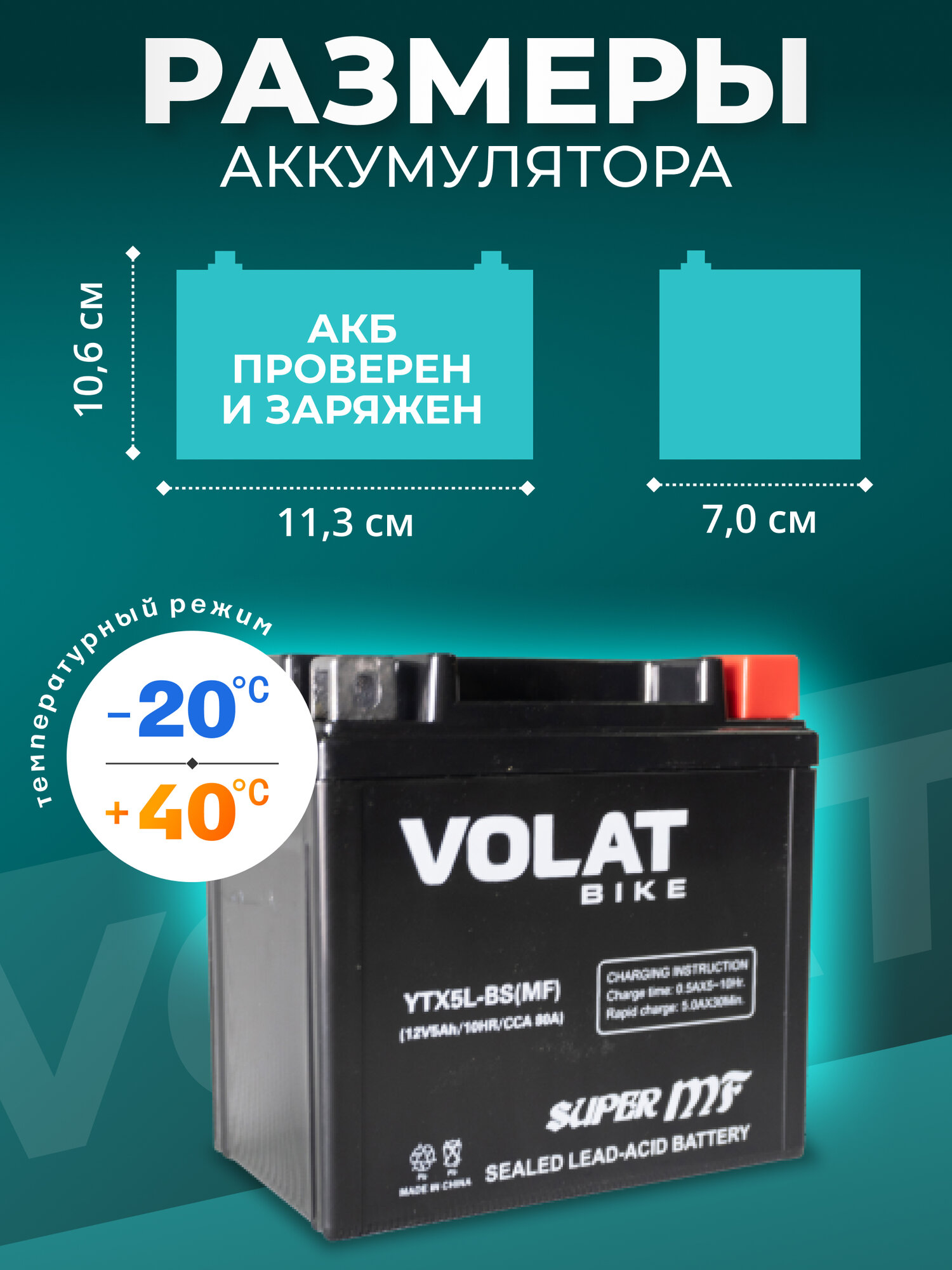 VOLAT YTX5LBSMF VOLAT YTX5L-BS (MF) 12V 5Ah 80A R+ (113х70х106)