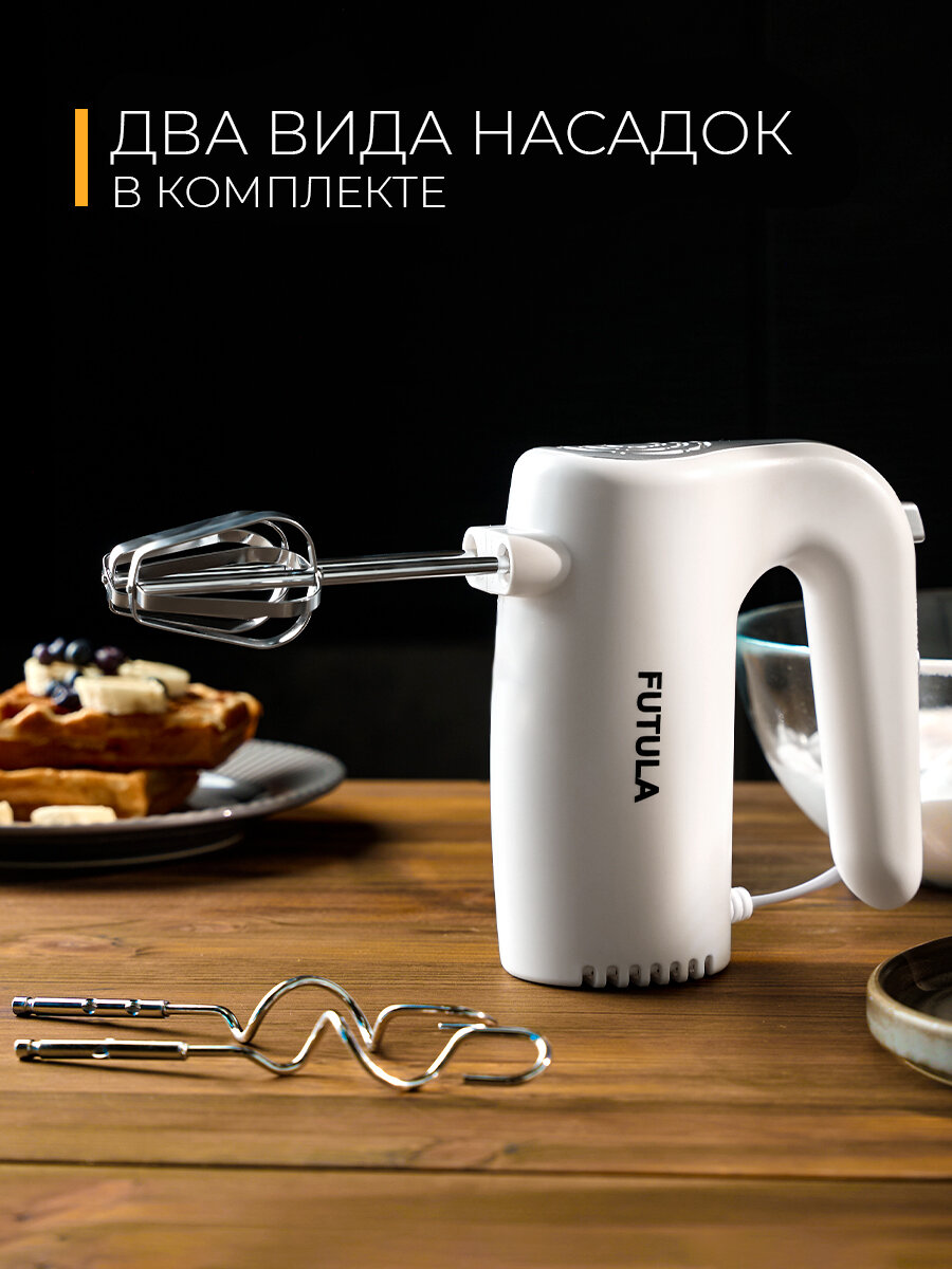 Миксер ручной кухонный FUTULA HM6 белый, 600 Вт, турбо режим, 5 скоростей работы, 2 вида насадок