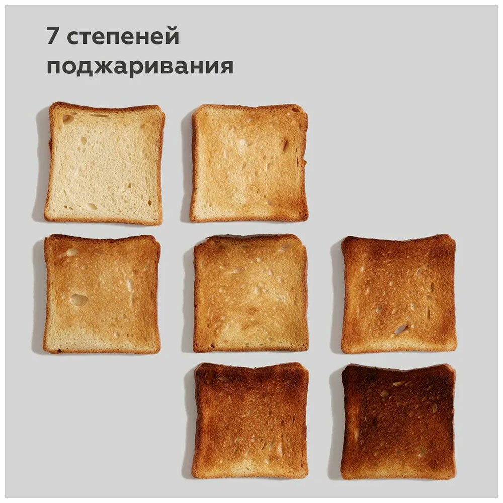 | Дополнительные функции | автоматическое поднятие тостов, автоматическое центрирование тостов, кнопка отмены, плавная регулировка температуры, регулировка степени обжаривания |