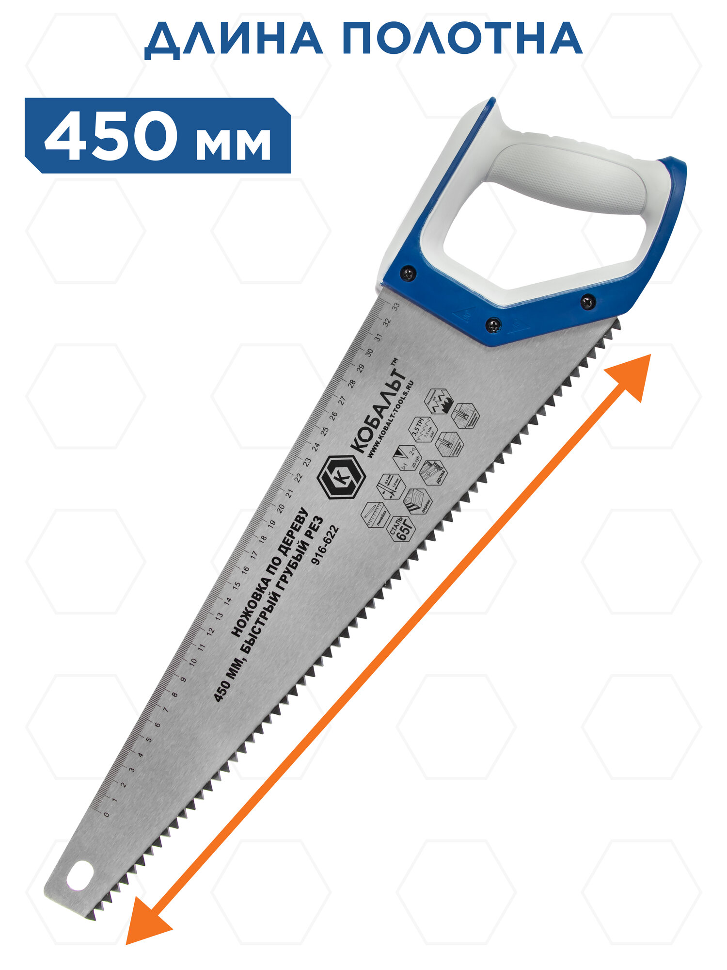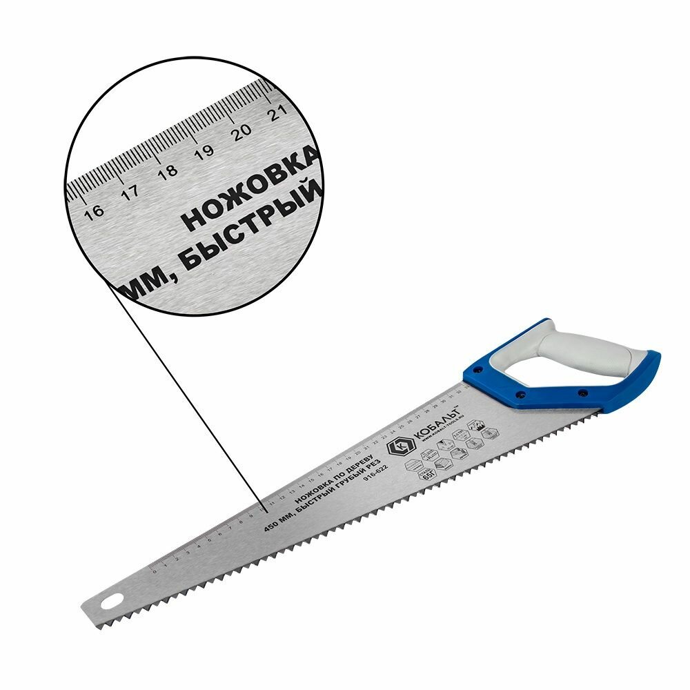Ножовка по дереву кобальт 450 мм, шаг 7,5 мм / 3,5 TPI, закаленный зуб, 2D-заточка, быстрый грубый рез, 2-х комп. рукоятка (916-622)