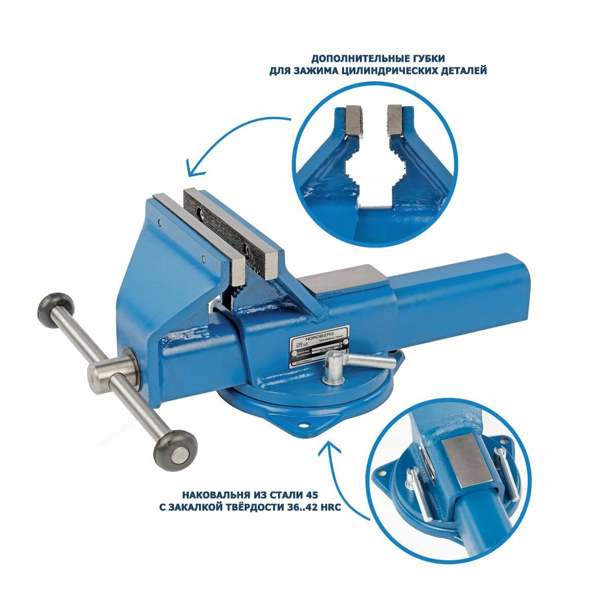Тиски слесарные стальные NORDBERG NTS160, глубина 123 мм, ширина губок 160 мм, рабочий ход 200 мм, усилие 3000 кгс, углеродистая сталь