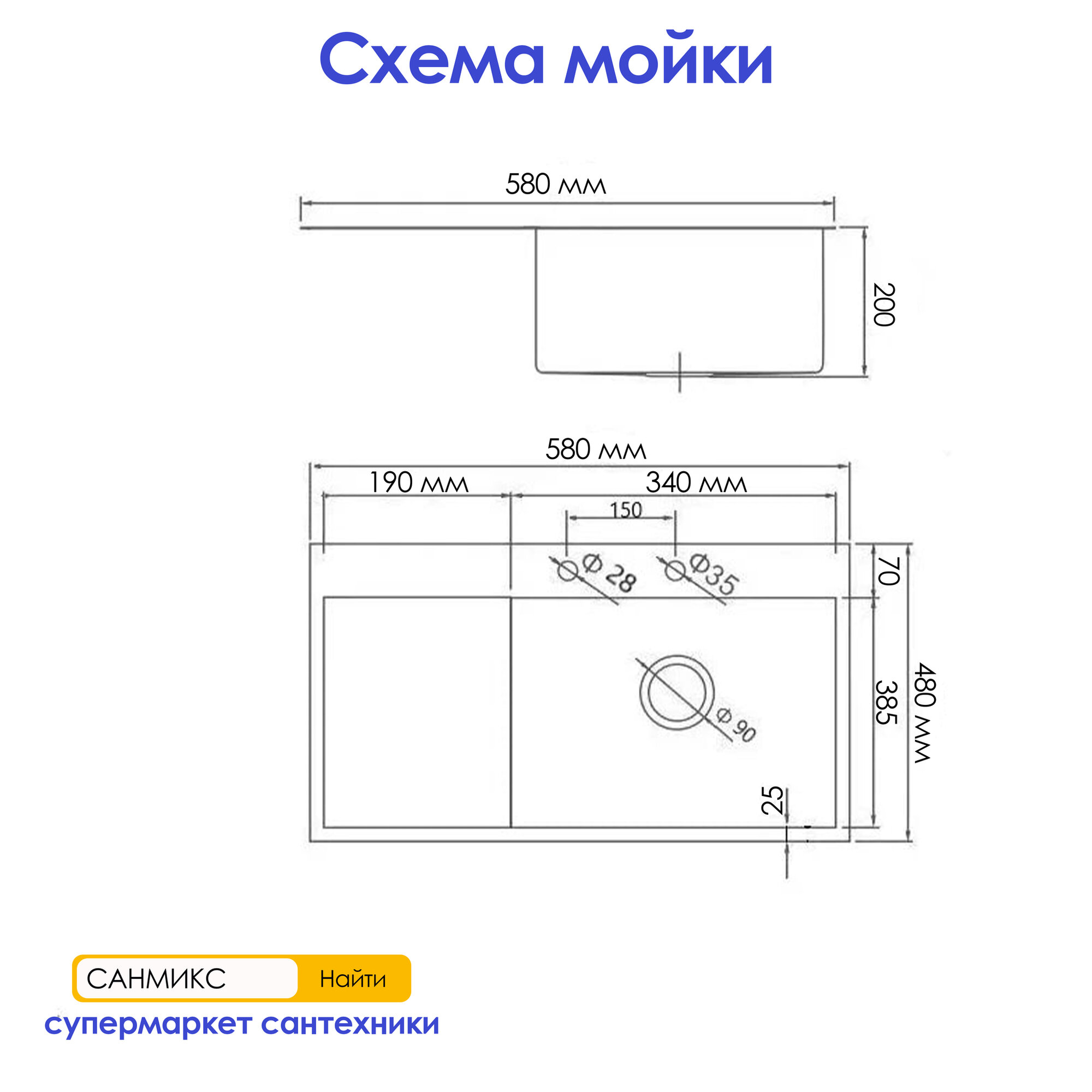 Мойка для кухни Премиум класса 58х48 Сатин, нержавеющая врезная, чаша справа, 3 мм толщина, выпуск 3 1/2, с сифоном