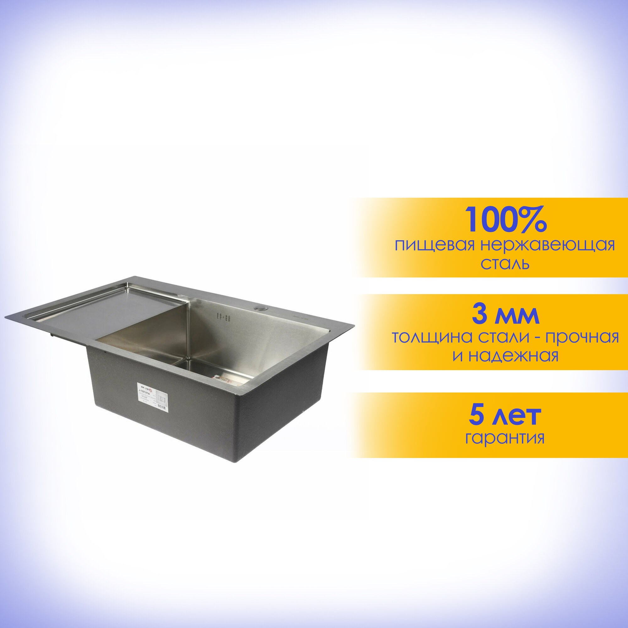 | Особенности | PVD покрытие / отверстие под кран-фильтр / отверстие под смеситель / сливная арматура |