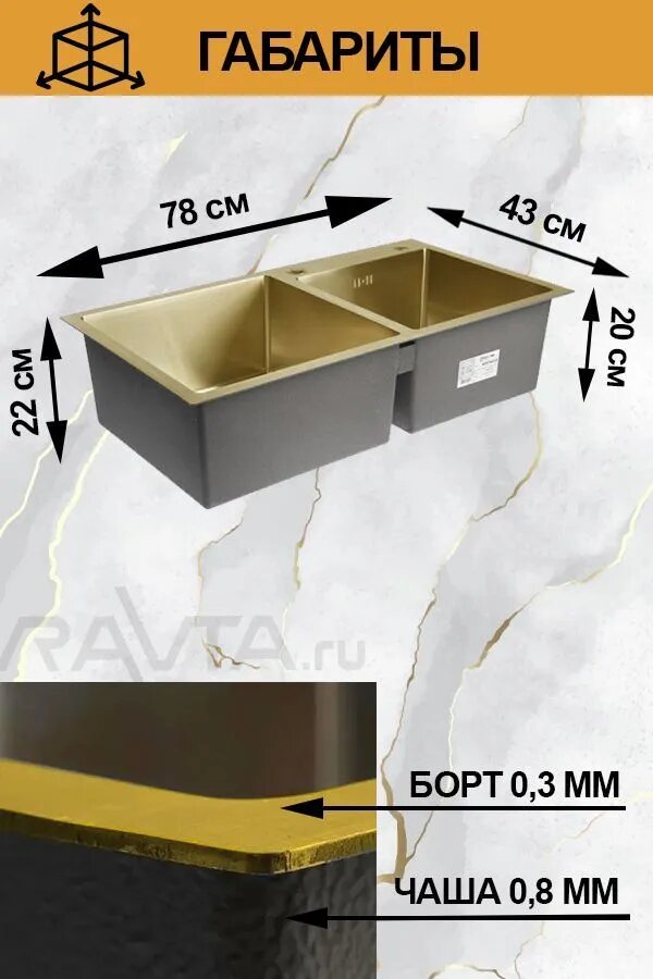 СохранитьМойка для кухни двойная из нержавеющей стали 3мм врезная 78х43 золото Премиум AFLORN AF97843W-D интересное: