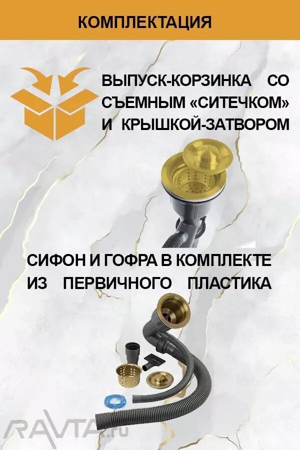 | Дополнительная информация | Комплектация Выпуск - сливная корзинка с ситечком и крышкой-затвором, сифон, перелив, гофра |