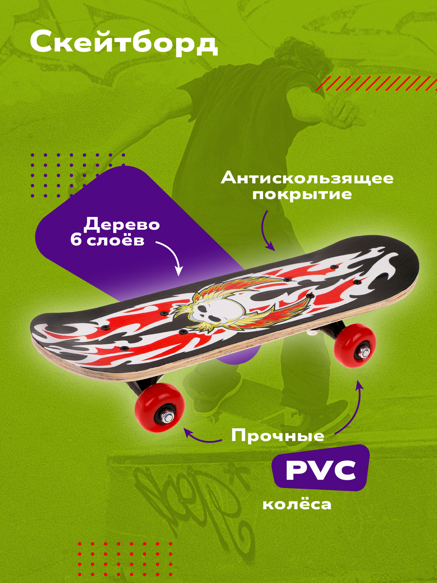 Ниже Вы можете прочитать отзывы на Скейтборд детский Череп с крыльями, дерево, PVC колеса без света 43*13 см, нагрузка до 45 кг, ознакомится с подробными характеристиками, посмотреть интересные обзоры и фотографии на Скейтборд детский Череп с крыльями, дерево, PVC колеса без света 43*13 см, нагрузка до 45 кг.