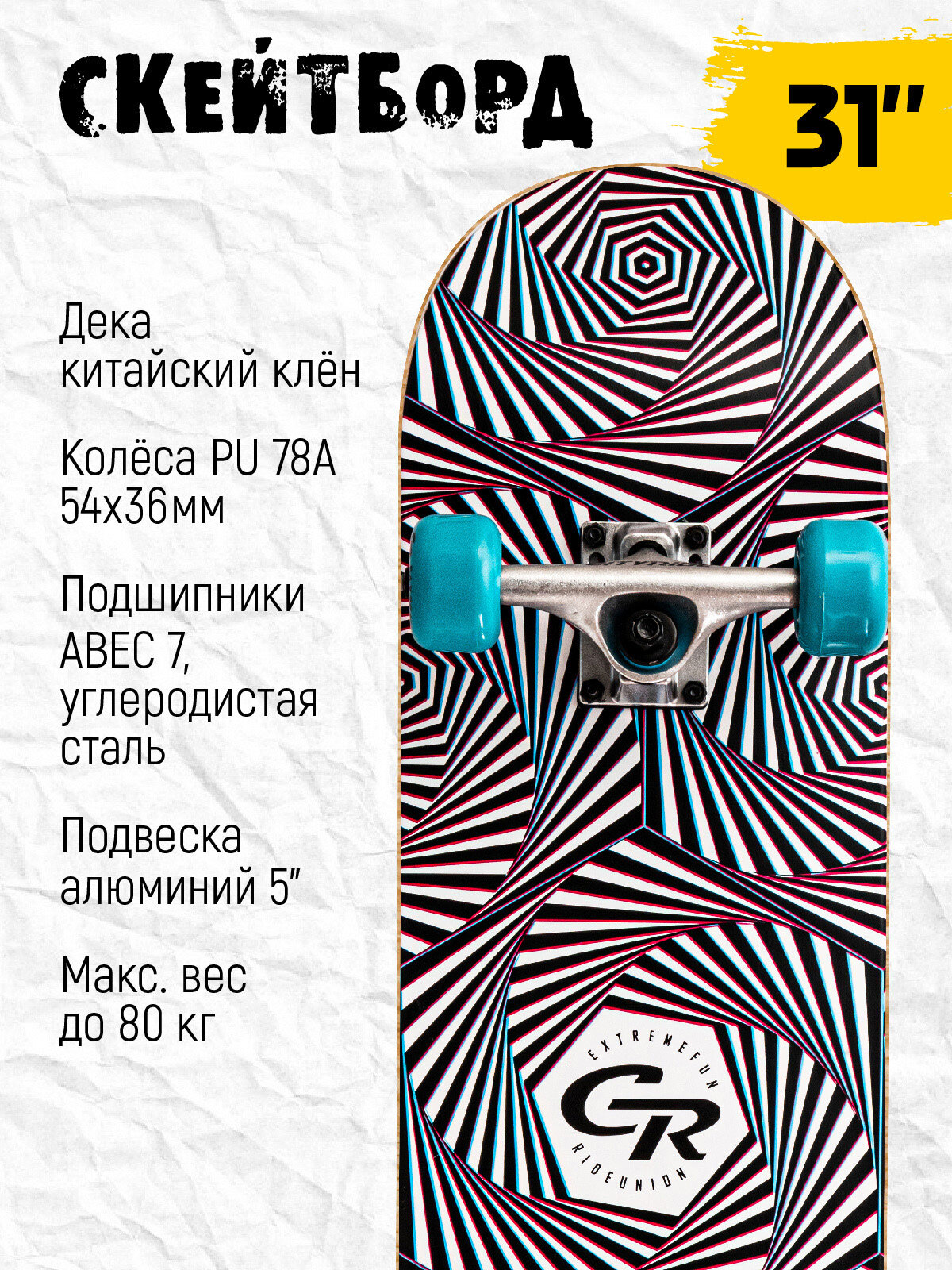 Скейтборд ТМ CITYRIDE, дека клен 9 слоев, размер 31"*8", колеса: 54*36мм, PU, 85А, ABEC-7, JB4200200