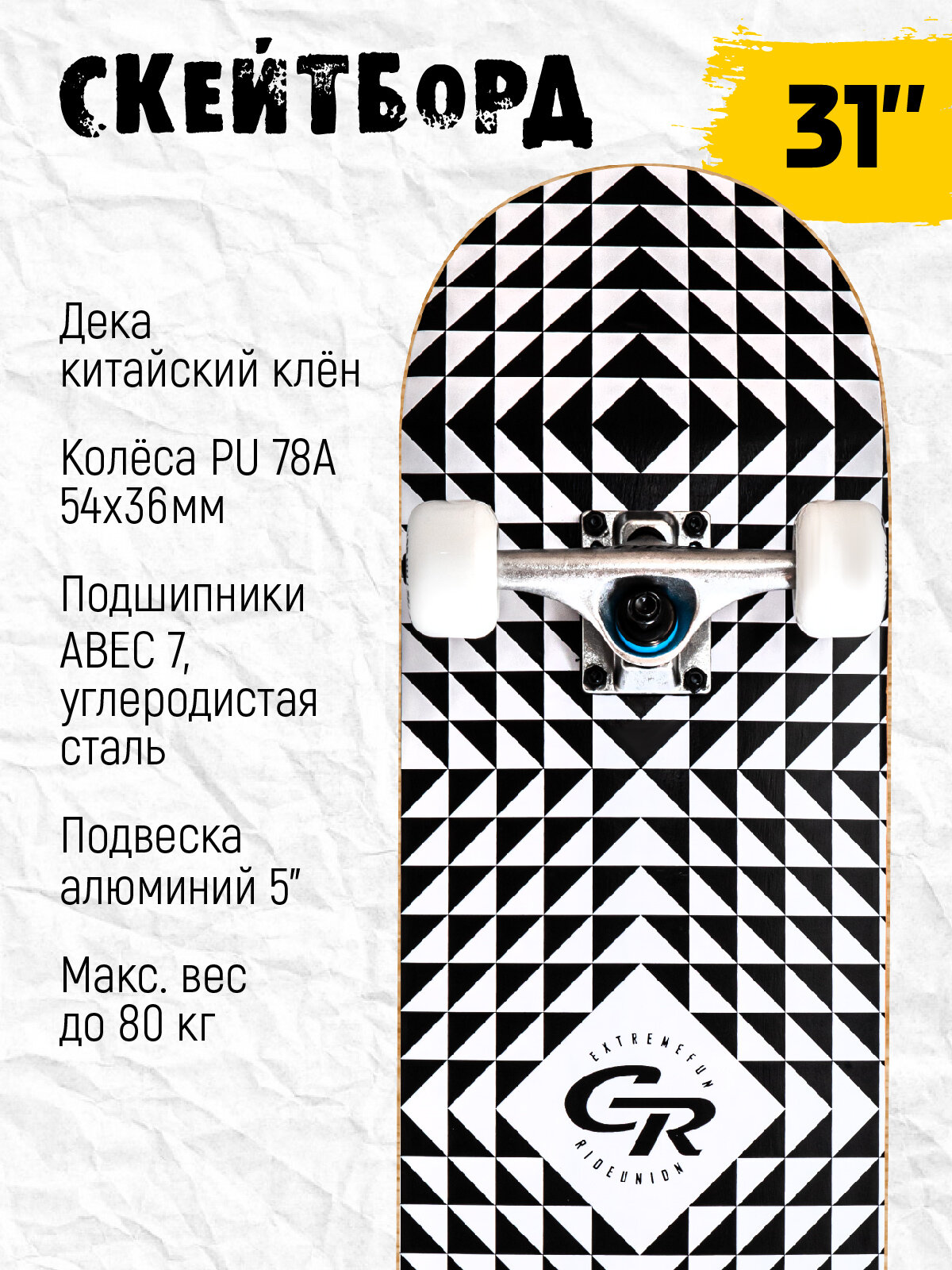 Купить Скейтборд ТМ CITYRIDE, дека клен 9 слоев, размер 31"*8", колеса: 54*36мм, PU, 85А, ABEC-7, JB4200195