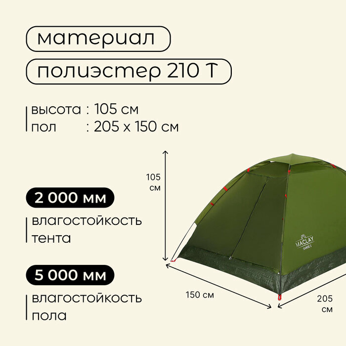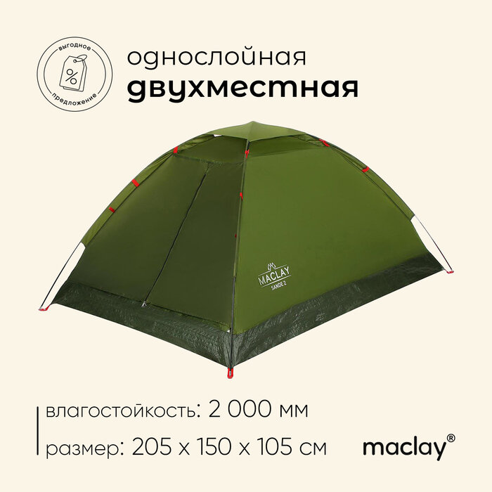 Maclay Палатка туристическая Maclay SANDE 2, р. 205х150х105 см, 2-местная, однослойная