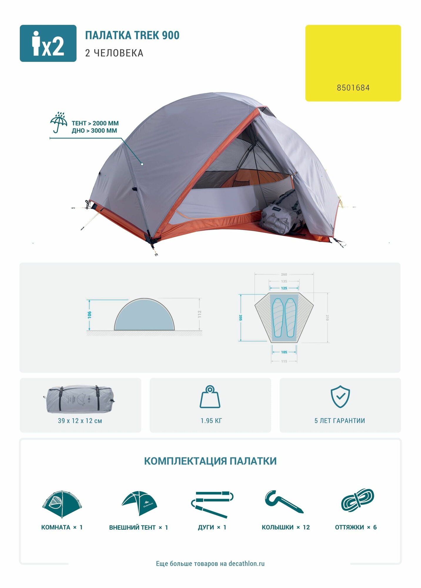| Дополнительная информация | диаметр дуг: 9 мм; длина внутренней палатки: 210 см; ширина внутренней палатки: 125 см; высота внутренней палатки: 100 см; количество вентиляционных отверстий: 2; подробная комплектация: Двойная крыша 550 г Комната 660 г Набор дуг 500 г Колышки (12 штук) 120 г Чехлы 60 г + 13 г Растяжки (6 штук) 30 г |