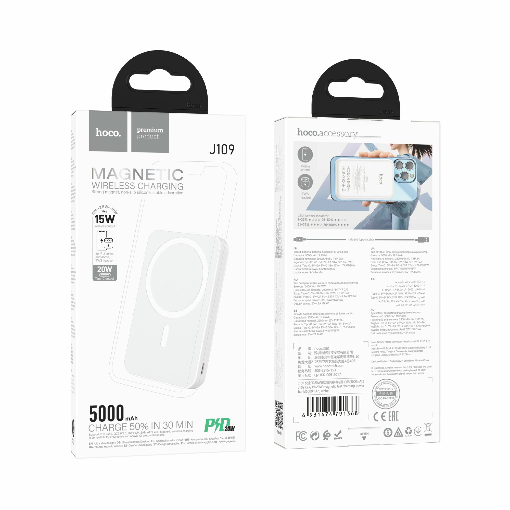 Внешний аккумулятор повербанк Hoco J109 5000 mAh MagSafe с быстрой зарядкой fast charge (PD/QC/FCP/AFC), белый