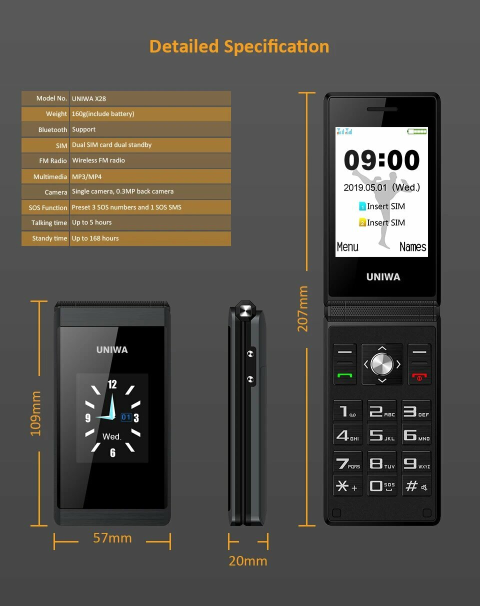 Купить UNIWA X28 Большой кнопочный телефон Старший флип-мобильный телефон GSM Dual Sim FM-радио Русский иврит Клавиатура Мобильный телефон-раскладушка, Russian Keyboard, UNIWA, x28, Смартфон, Черный, 8ГБ, russia, Новый