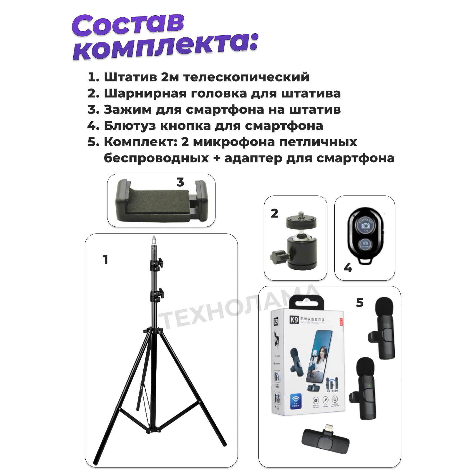 Штатив с держателем телефона + 2 микрофона беспроводных для шортс рилс (версия LIGHTNING айфон)