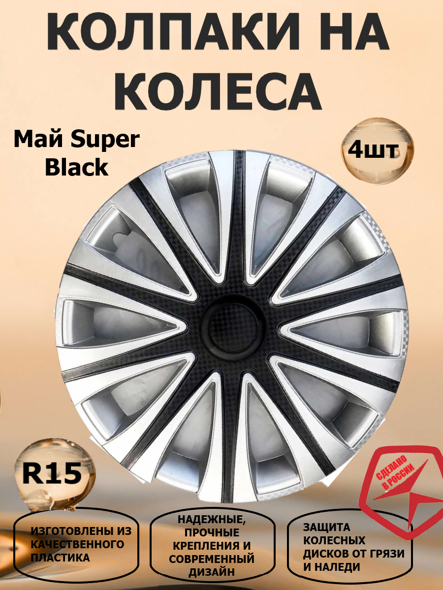 Колпаки на колеса R15 Май Super Silver, цвет серебристый/черный, 4 штуки в комплекте