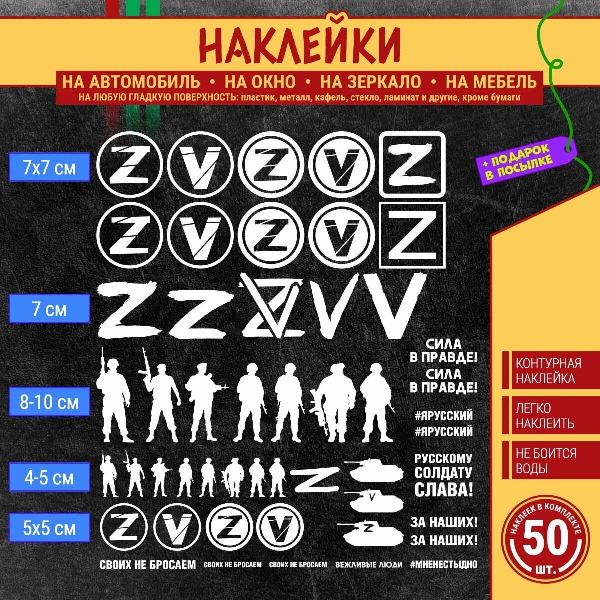 Купить Набор наклеек на автомобиль "Буква Z и V. Силуэты военных. За наших. Своих не бросаем. Сила в правде. СВО" 50 шт, 7х7 см, 8х5 см, 5х5 см, белая