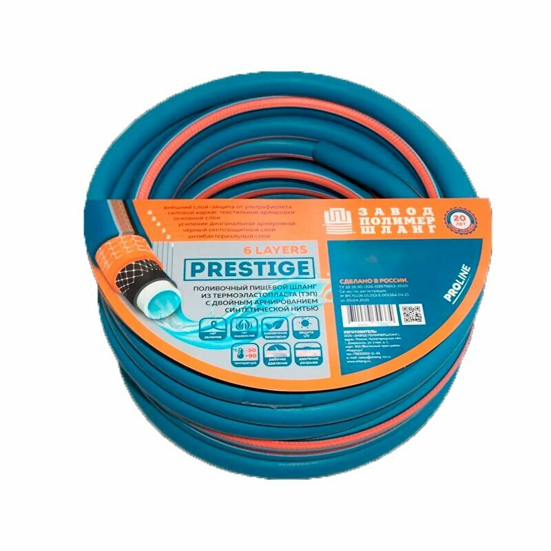 Шланг для полива "PRESTIGE", 3/4 дюйма, 25 метров, 6 слоев, ТЭП, цвет синий/оранжевый